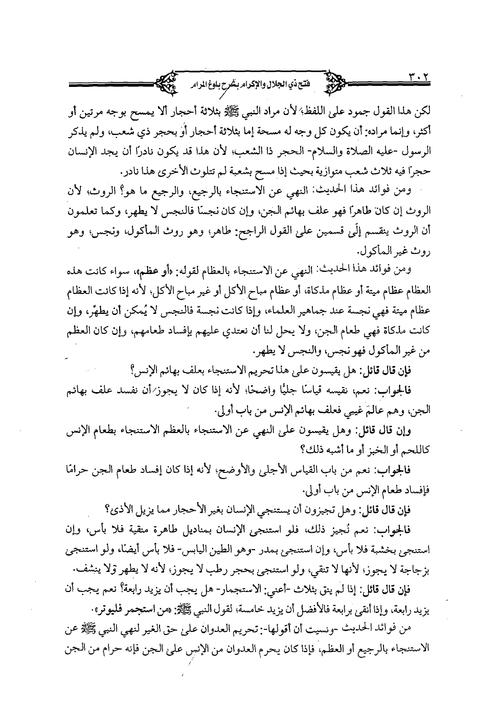 لكن هذا القول جمود على اللفظ؛ لأن مراد النبي صلى الله عليه وسلم بثلاثة أحجار ألا يمسح بوجه مرتين أو أكثر، وإنما مراده: أن يكون كل وجه له مسحة إما بثلاثة أحجار أو بحجر ذي شعب، ولم يذكر الرسول - عليه الصلاة والسلام- الحجر ذا الشعب؛ لأن هذا قد يكون نادرا أن يجد الإنسان حجرا فيه ثلاث شعب متوازية بحيث إذا مسح بشعبة لم تتلوث الأخرى هذا نادر.