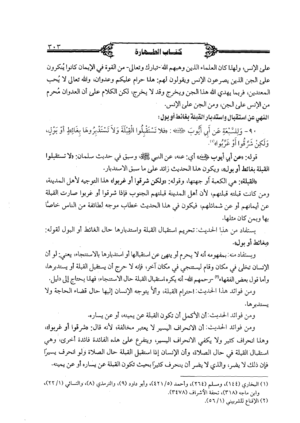 90 - وللسبعة عن أبي أيوب رضي الله عنه: "فلا تستقبلوا القبلة ولا تستدبروها بغائط أو بول، ولكن شرقوا أو غربوا".