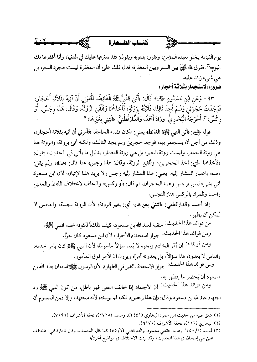 93 - وعن ابن مسعود رضي الله عنه قال: "أتى النبي صلى الله عليه وسلم الغائط، فأمرني أن آتيه بثلاثة أحجار، فوجدت حجرين ولم أجد ثالثا، فأتيته بروثة، فأخذهما وألقى الروثة، وقال: هذا رجس، أو ركس". أخرجه البخاري. وزاد أحمد، والدارقطني: "أئتني بغيرها".