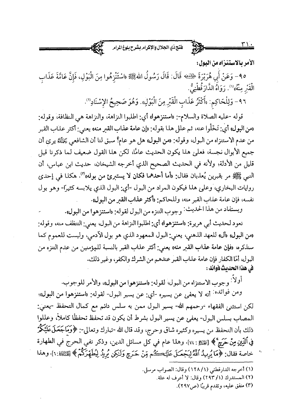 95 - وعن أبي هريرة رضي الله عنه قال: قال رسول الله صلى الله عليه وسلم: "استنرهوا من البول، فإن عامة عذاب القبر منه". رواه الدارقطني.