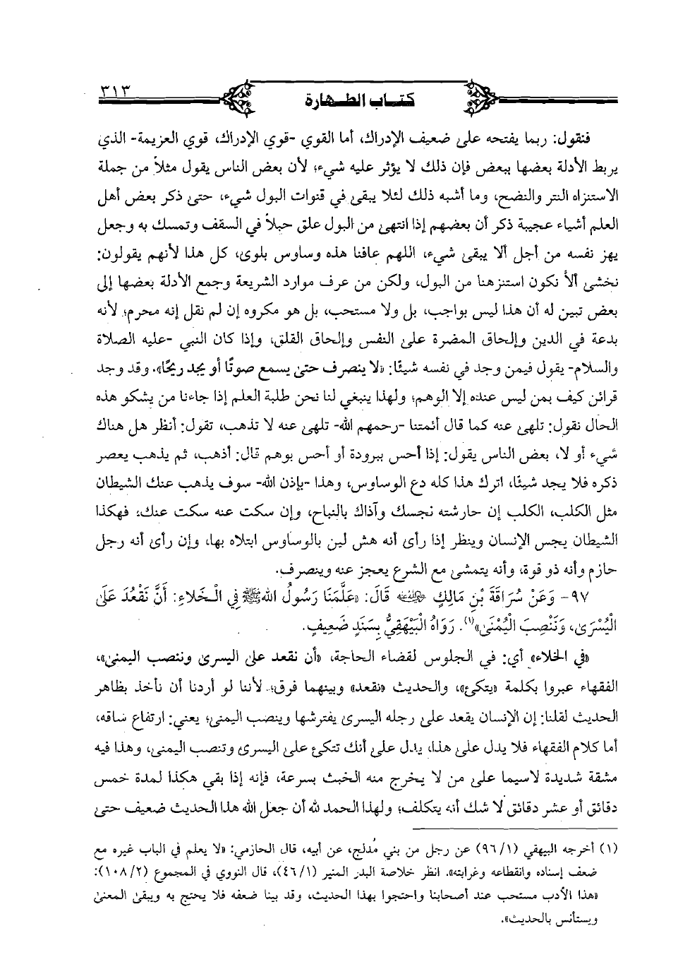 فنقول: ربما يفتحه على ضعيف الإدراك أما القوي - قوي الإدراك، قوي العزيمة- الذي يربط الأدلة بعضها ببعض فإن ذلك لا يؤثر عليه شيء؛ لأن بعض الناس يقول مثلا من جملة الاستنزاه النتر والنضح، وما أشبه ذلك لئلا يبقى في قنوات البول شيء، حتى ذكر بعض أهل العلم أشياء عجيبة ذكر أن بعضهم إاذ انتهى من البول علق حبلا في السقف وتمسك به وجعل يهز نفسه من أجل الا يبقى شيء، اللهم عافنا هذه وساوس بلوى، كل هذا لأنهم يقولون: نخشى ألا نكون استنزهنا من البول، ولكن من عرف موارد الشريعة وجمع الأدلة بعضها إلى بعض تبين له أن هذا ليس بواجب، بل ولا مستحب، بل هو مكروه إن لم نقل إنه محرم، لأنه بدعة في الدين وإلحاق المضرة على النفس وإلحاق القلق، وإذا كان النبي - عليه الصلاة والسلام- يقول فيمن وجد في نفسه شيئا: "لا ينصرف حتى يسمع صوتا أو يجد ريحا". وقد وجد قرائن كيف بمن ليس عنده إلا الوهم؛ ولهذا ينبغي لنا نحن طلبة العلم إذا جاءنا من يشكو هذه الحال نقول: تلهى عنه كما قال أئمتنا - رحمهم الله- تلهى عنه لا تذهب، تقول: أنظر هل هناك شيء أو لا، بعض الناس يقول: إذا أحس ببرودة أو أحس بوهم قال: أذهب، ثم يذهب يعصر ذكره فلا يجد شيئا، اترك هذا كله دع الوساوس، وهذا - بإذن الله- سوف يذهب عنك الشيطان مثل الكلب، الكلب إن حارشته نجسك وآذاك بالنجاح، وإن سكت عنه سكت عنك؛ فهكذا الشيطان يجس الإنسان وينظر إذا رأى أنه هش لين بالوساوس ابتلاه بها، وإن رأى أنه رجل حازم وأنه ذو قوة، وأنه يتمشى مع الشرع يعجز عنه وينصرف.