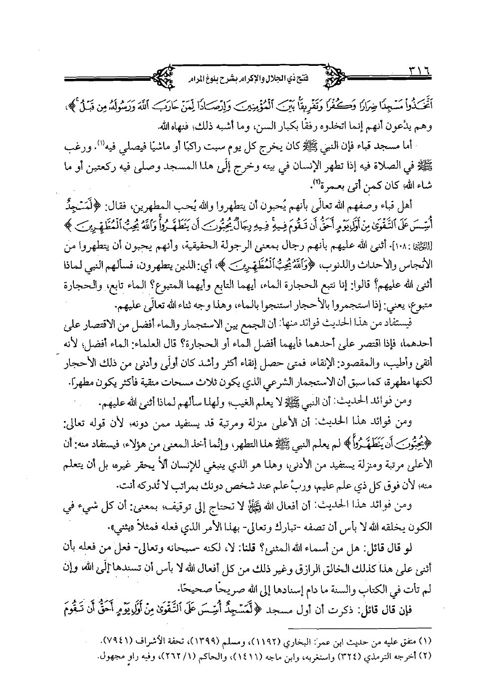 أهل قباء وصفهم الله تعالى بأنهم يحبون أن يتطهروا والله يحب المطهرين، فقال: {لمسجد أسس على التقوى من أول يوم أحق أن تقوم فيهفيه رجال يحبون أن يتطهروا والله يحب المطهرين} [التبة: 108]. أثنى الله عليهم بأنهم رجال بمعنى الرجولة الحقيقية، وأنهم يحبون أن يتطهروا من الأنجاس والأحداث والذنوب، {والله يحب المطهرين}، أي: الذين يتطهرون، فسألهم النبي لماذا أثنى الله عليهم؟ قالوا: إنا نتبع الحجارة الماء، أيهما التابع وأيهما المتبوع؟ الماء تابع، والحجارة متبوع، يعني: إذا استجمروا بالأحجار استنجوا بالماء، وهذا وجه ثناء الله تعالى عليهم.
