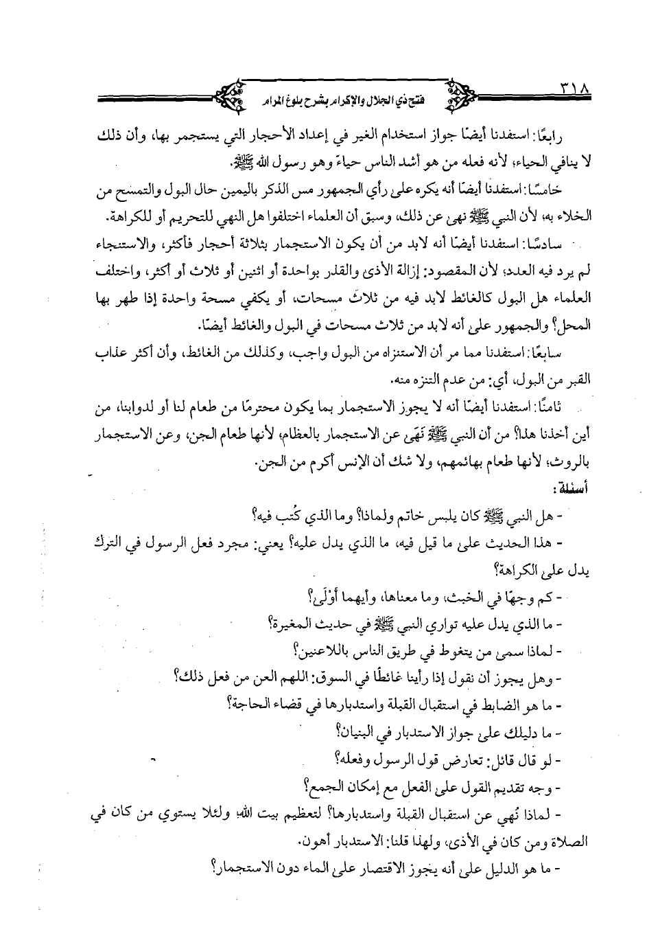 سادسا: استفدنا أيضا أنه لابد من أن يكون الاستجمار بثلاثة أحجار فأكثر، والاستنجاء لم يرد فيه العدد؛ لأن المقصود: إزالة الأذى والقذر بواحدة أو اثنين أو ثلاث أو أكثر، واختلف العلماء هل البول كالغائط لابد فيه من ثلاث مسحات، أو يكفي مسحة واحدة إاذ طهر بها المحل؟ والجمهور على أنه لابد من ثلاث مسحات في البول والغائط أيضا.