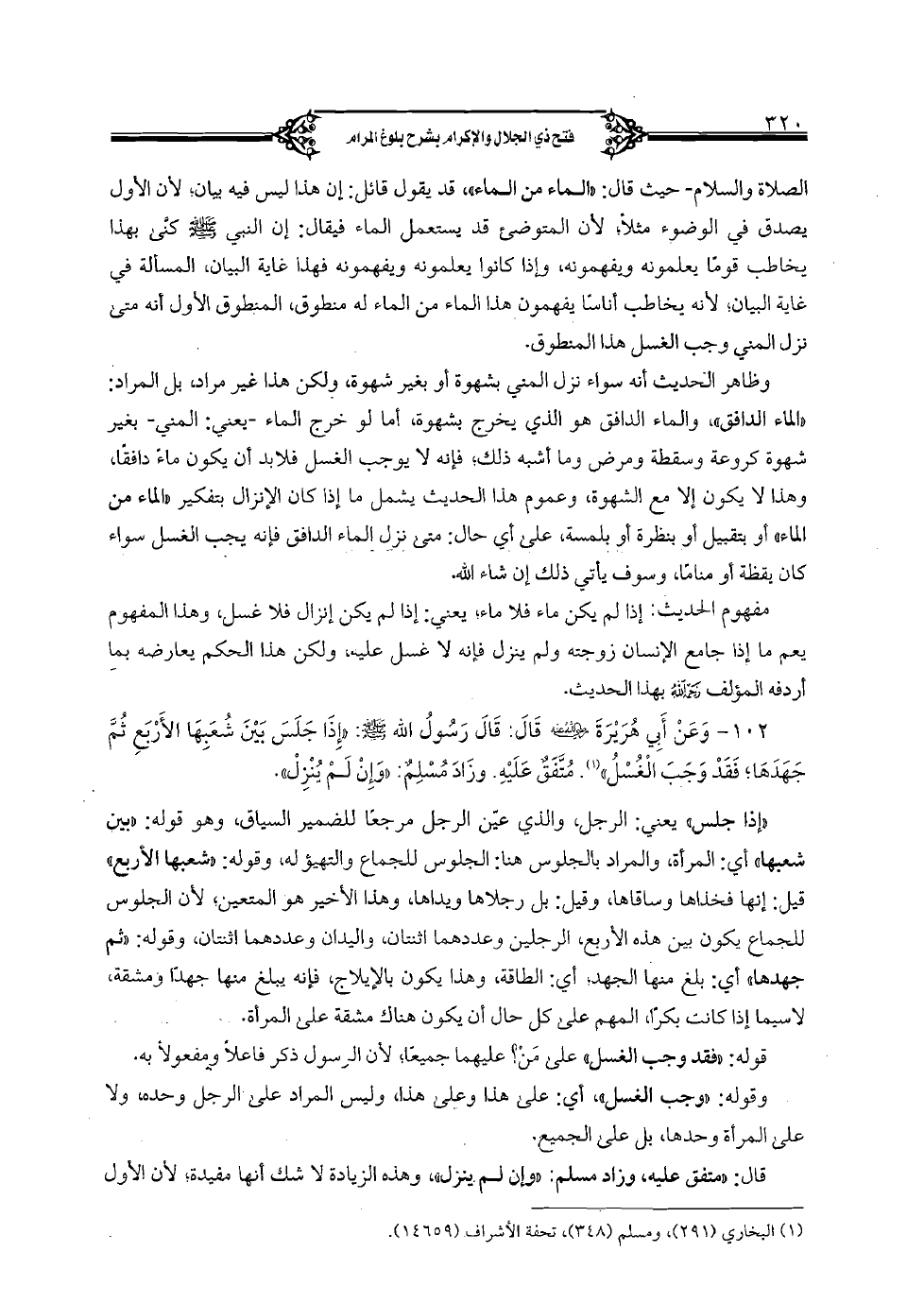 102 - وعن أبي هريرة رضي الله عه قال: قال رسول الله صلى الله عليه وسلم: "إذا جلس بين شعبها الأربع ثم جهدها؛ فقد وجب الغسل". متفق عليه. وزاد مسلم: "وإن لم ينزل".