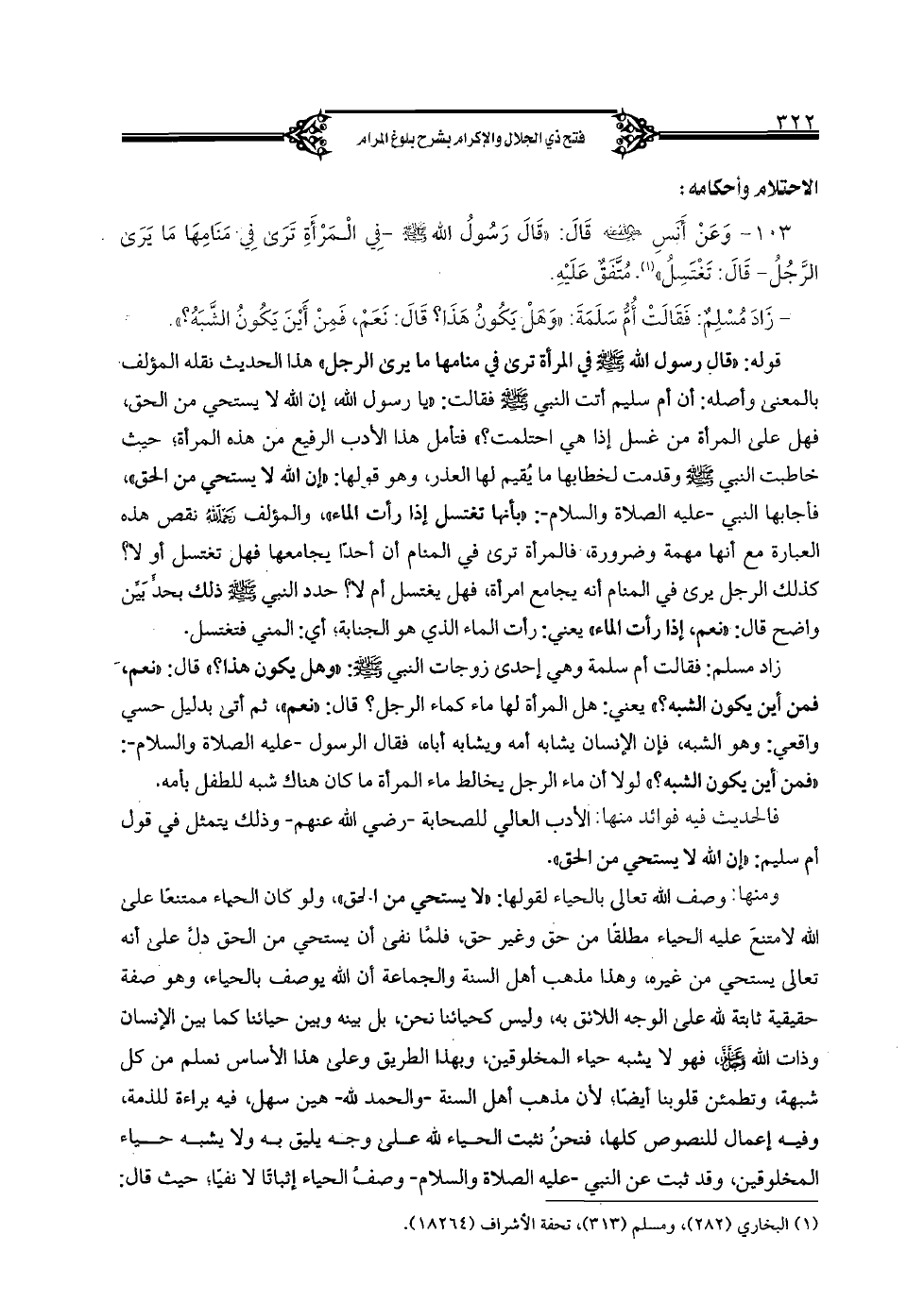 103 - وعن أنس رضي الله عنه قال: "قال رسول الله صلى الله عليه وسلم - في المرأة ترى في منامها ما يرى الرجل- قال: تغتسل". متفق عليه.