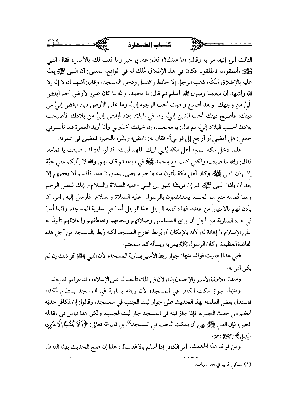 الثالث أتى إليه، مر به وقال: "ما عندك؟ " قال: عندي خير وما قلت لك بالأمس، فقال النبي صلى الله عليه وسلم: "أطلقوه"، فأطلقوه، فكان في هذا الإطلاق ملك له في الواقع، بمعنى: أن النبي صلى الله عليه وسلم بمنه عليه بالإطلاق ملكه، ذهب الرجل إلا حائط واغتسل ودخل المسجد، وقال: أشهد أن لا إله إلا الله وأشهد أن محمدا رسول الله، أسلم ثم قال: يا محمد، والله ما كان على الأرض أحد أبغض إلي من وجهك؛ ولقد أصبح وجهك أحب الوجوه إلي، وما على الأرض دين أبغض إلي من دينك؛ فأصبح دينك أحب الدين غلأي، وما في البلاد بلاد أبغض إلي من بلادك؛ فأصبحت بلادك أحب البلاد إلي، ثم قال: يا محمد، إن خيلك أخذوني وأنا أريد العمرة فما تأمرني - يعني: هل أمضي أو أرجع إلى قومي؟ -فقال له: "امض" وبشره بالخير، فمضى في عمرته.