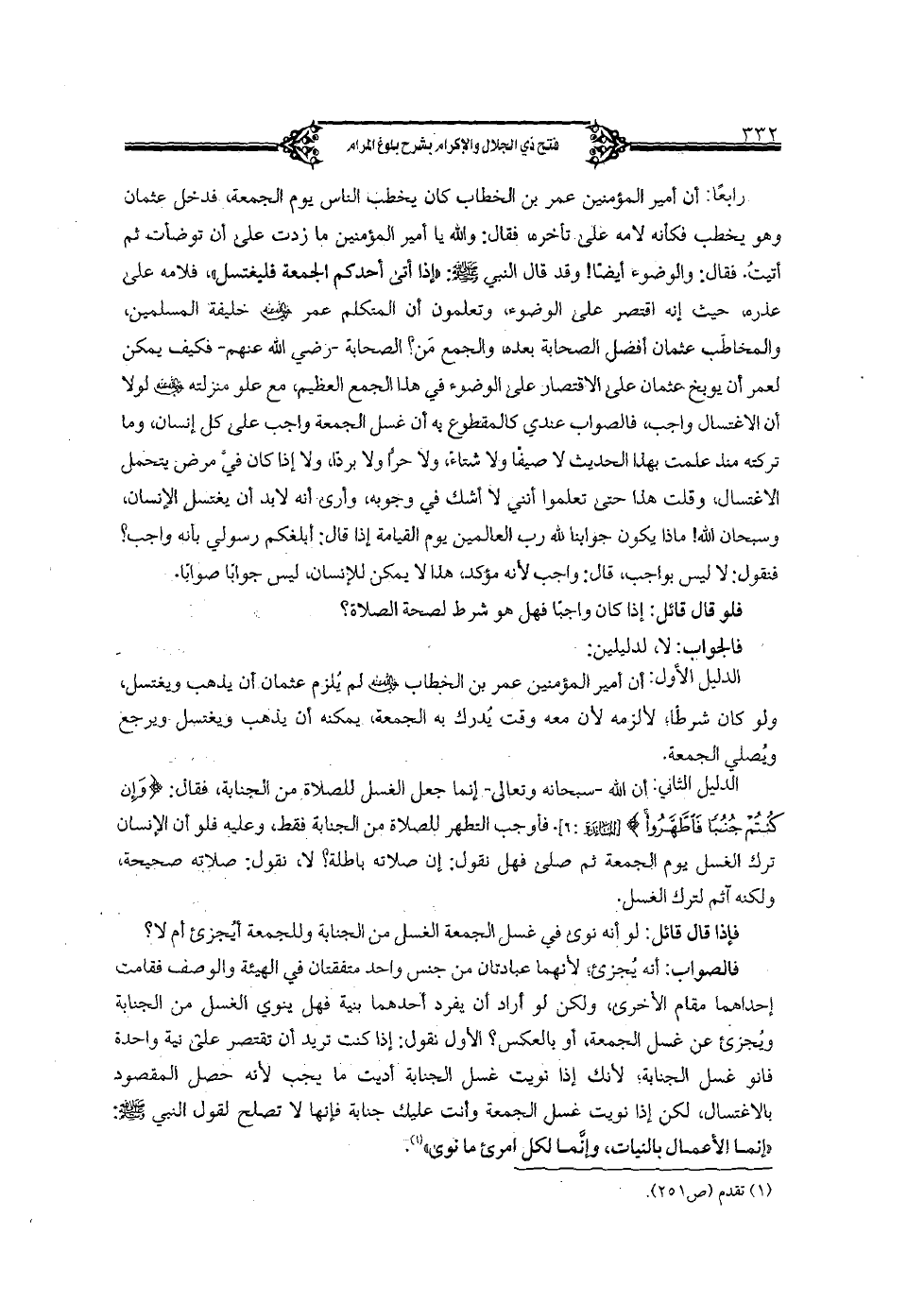 الدليل الأول: أن أمير المؤمنين عمر بن الخطاب رضي الله عنه لم يلزم عثمان أن يذهب ويغتسل، ولو كان شرطا؛ لألزمه لأن معه وقت يدرك به الجمعة، يمكنه أن يذهب ويغتسل ويرجع ويصلي الجمعة.