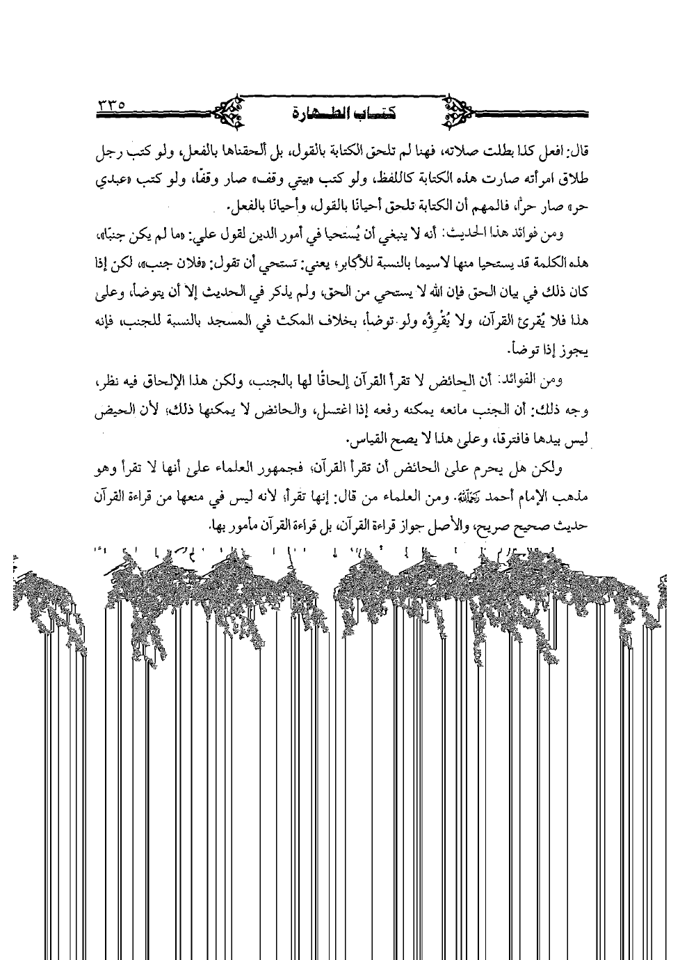 ومن فوائد هذا الحديث: أنه لا ينبغي أن يستحيا في أمور الدين لقول علي: "ما لم يكن جنبا"، هذه الكلمة قد يستحيا منها لاسيما بالنسبة للأكابر؛ يعني: تستحي أن تقول: "فلان جنب"، لكن إذا كان لذك في بيان الحق فإن الله لا يستحي من الحق، ولم يذكر في الحديث إلا أن يتوضأ، وعلى هذا فلا يقرئ القرآن، ولا يقرؤه ولم توضأ، بخلاف المكث في المسجد بالنسبة للجنب، فإنه يجوز إذا توضأ.