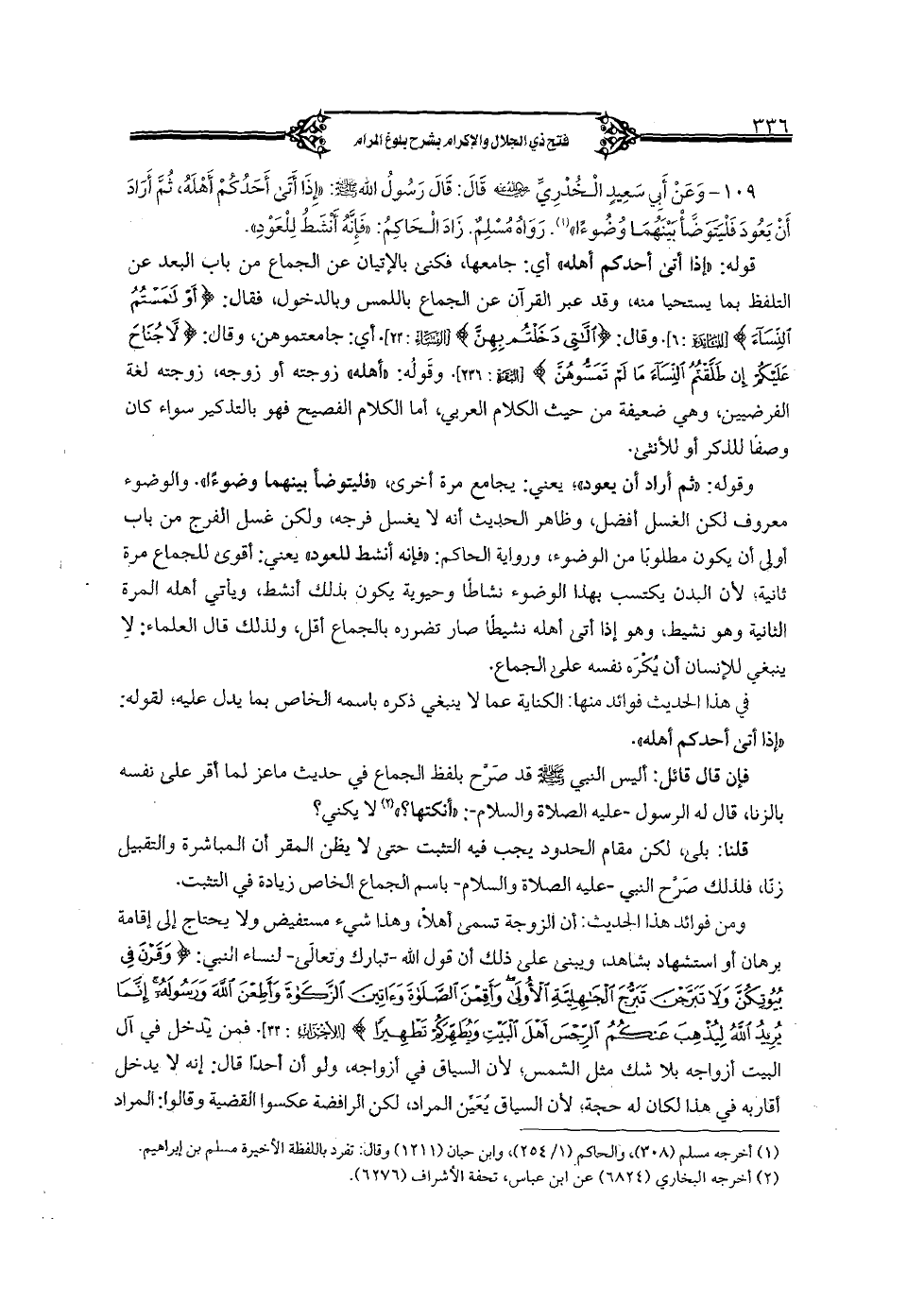 109 - وعن أبي سعيد الخدري رضي الله عنه قال: قال رسول الله صلى الله عليه وسلم: "إذا أتى أحدكم أهله، ثم أراد أن يعود فليتوضأ بينهما وضوءا". رواه مسلم. زاد الحاكم. "فإنه أنشط للعود".
