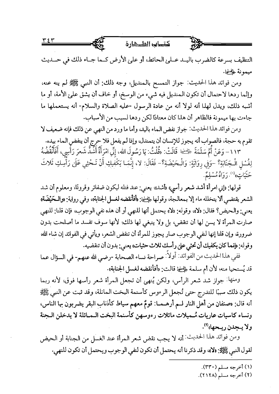 قولها: "إني امرأة أشد شعري" "أشد"؛ يعني: عند فتله ليكون ضفائر وقرونا، ومعلوم أن شد الشعر يقتضي ألا يتخلله ماء إلا بمعالجة، وقولها رضي الله عنها: "أفأنقضه لغسل الجنابة"، وفي رواية: "والحيضة" يعني: والحيض؟ فقال: "لا"، وقوله: "لا" يحتمل أنها للنهي أو أن هذه نفي الوجوب، فإن قلنا: للنهي صارت المرأة لا يسن لها أن تنقض، بل ولا ينبغي لها ذلك؛ لأنها سوف تفسد ما أصلحت بدون ضرورة، وغن قلنا إنها لنفي الوجوب صار يجوز للمرأة أن تنقض الشعر، ويأتي في الفوائد إن شاء الله، وقوله: "إنما كان يكفيك أن تحثي على رأسك ثلاث حثيات" يعني: بدون أن تنقضيه.