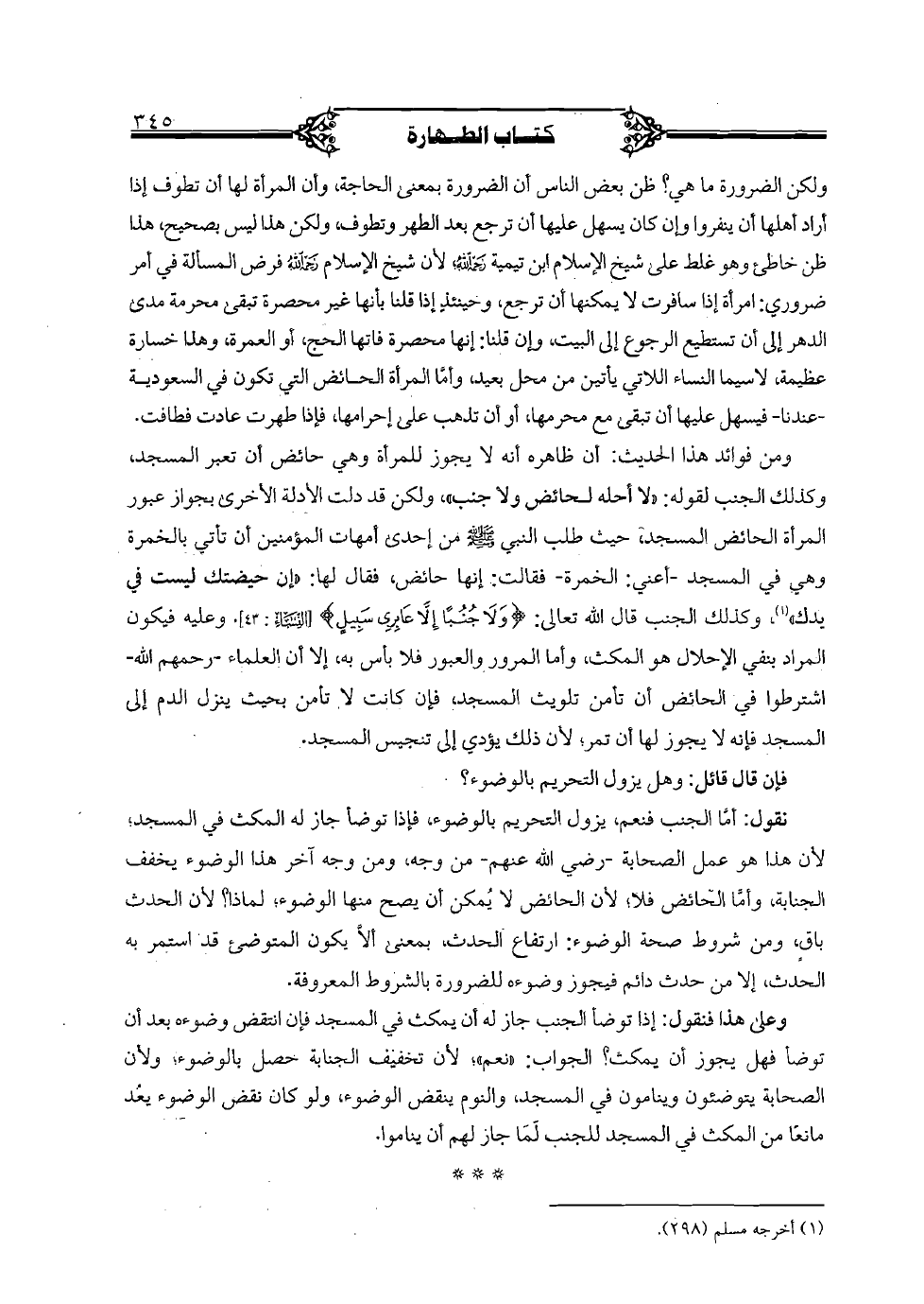 ولكن الضرورة ما هي؟ ظن بعض الناس أن الضرورة بمعنى الحاجة، وأن المرأة لها أن تطوف إذا أراد أهلها أن ينفوا وإن كان يسهل عليها أن ترجع بعد الطهر وتطوف، ولكن هذا ليس بصحيح، هذا ظن خاطئ وهو غلط على شيخ الإسلام ابن تيمية رحمه الله؛ لأن شيخ الإسلام رحمه الله فرض المسألة في أمر ضروري: امرأة إذا سافرت لا يمكنها أن ترجع، وحينئذ إذا قلنا بأنها غير محصرة تبقى محرمة مدى الدهر إلى أن تستطيع الرجوع إلى البيت، وإن قلنا: إنها محصرة فاتا الحج، أو العمرة، وهذا خسارة عظيمة، لاسيما النساء اللاتي يأتين من محل بعيد، وأما المرأة الحائض التي تكون في السعودية - عندنا- فيسهل عليها أن تبقى مع محرمها، أو أن تذهب على إحرامها، فإذا طهرت ادت فطافت.