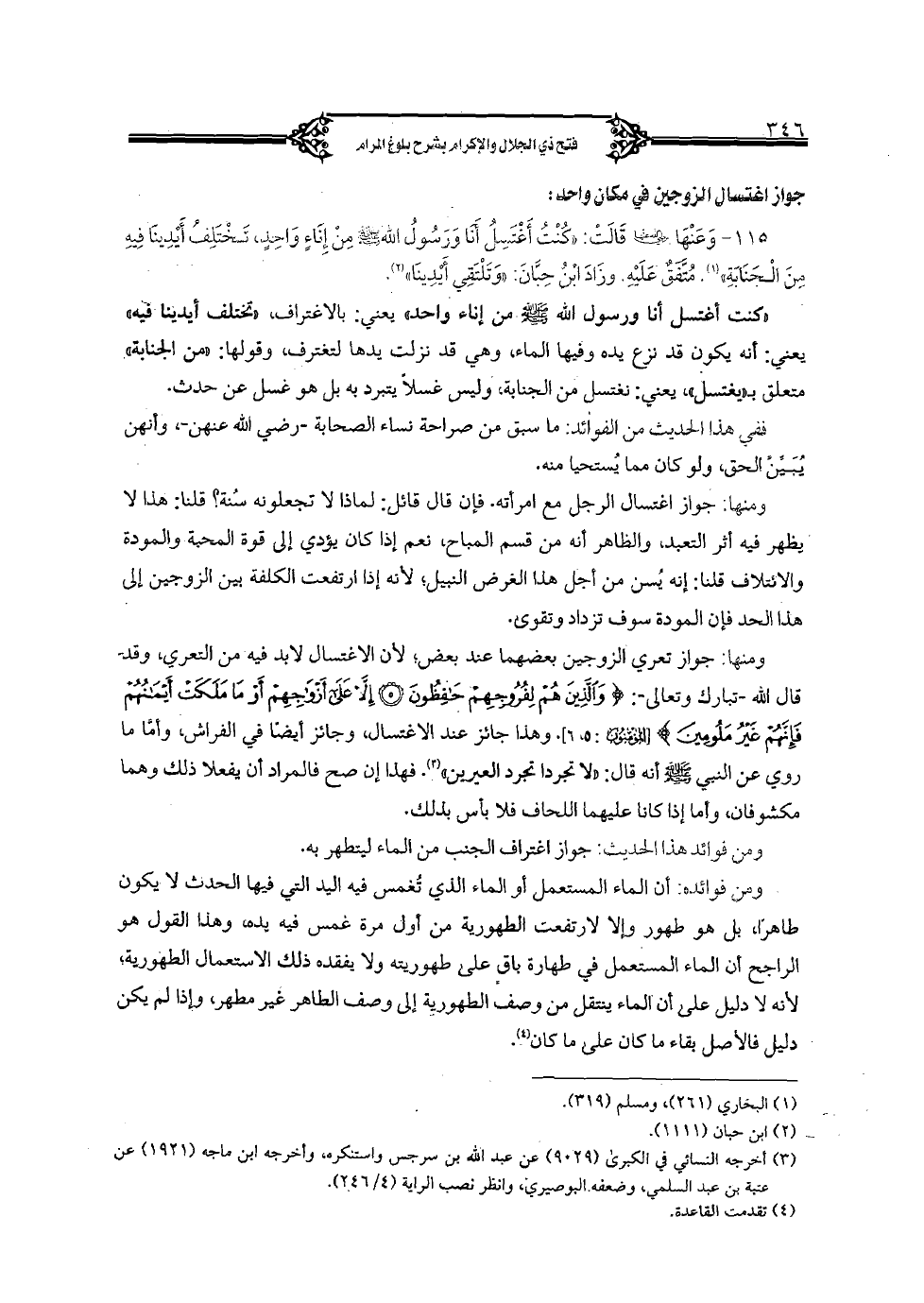 115 - وعنها رضي الله عنها قالت: "كنت أغتسل أنا ورسول الله صلى الله عليه سلم من إناء واحد، تختلف أيدينا فيه من الجنابة"". متفق عليه. وزاد ابن حبان: "وتلتقي أيدينا".