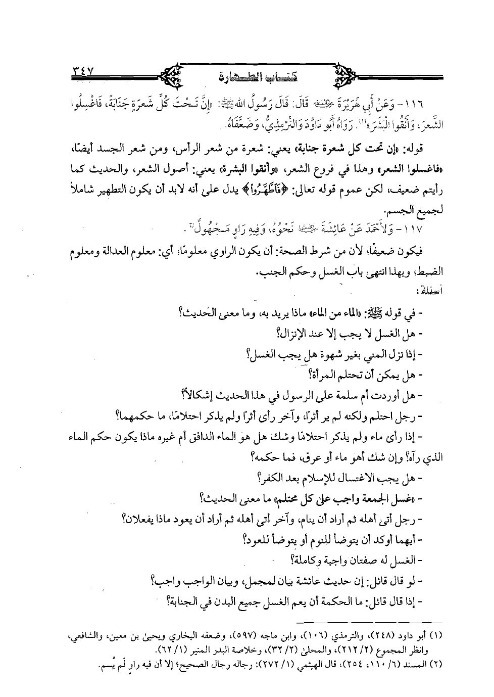116 - وعن أبي هريرة رضي الله عنه قال: قال رسول الله صلى الله عليه وسلم: "إن تحت كل شعرة جنابة، فاغسلوا الشعر، وأنقوا البشر". رواه أبو داود والترمذي وضعفاه.