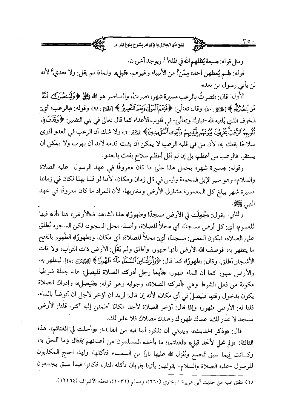والثاني: يقول: "جعلت لي الأرض مسجدا وطهورا} هذا الشاهد ف"الأرض" هنا "أل" فيها للعموم؛ أي: كل أرض مسجدا، أي محلا للصلاة، وأصله محل السجود، لكن السجود يطلق على الصلاة، فيكون المعنى: مسجدا، أي: محلا للصلاة، أي مكان، : وطهورا" الطهور بالفتح ما يتطهر به، فوصف الله الأرض بأنها طهور، وأطلق ولم يقل: الأرض ذات التراب، ولا ذات الأشجار أطلق، وقال: "طهورا" كما قال: {وأنزلنا من السماء ماء طهورا {[الفرقان: 48]. ليتطهر به، والأرض طهور كما أن الماء طهور، "فأيما رجل أدركته الصلاة فليصل" هذه جملة شريطة مكونة من فعل الشرط وهي "أدركته الصلاة"، وجوابه وهو قوله: "فليصل"، وإدراك الصلاة يكون بدخول وقتها فليصل في أي مكان؛ لأنه إن قال: أريد أن أؤخر لأجل أن أتوضأ بالماء.