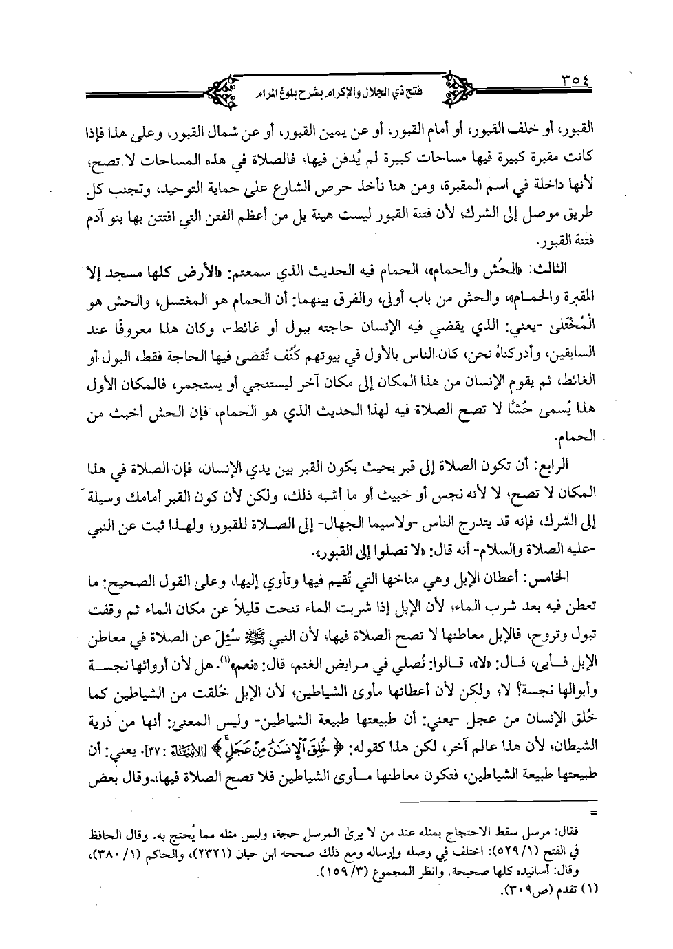 الثالث: "الحش والحمام"، الحمام فيه الحديث الذي سمعتم: "الأرض كلها مسجد إلا المقبرة والحمام"، والحش من باب أولى، والفرق بينهما: أن الحمام هو المغتسل، والحش هو المحتلى - يعني: الذي يقضي فيه الإنسان حاجته ببول أو غائط-، وكان هذا معروفا عند السابقين، وأدركناه نحن، كان الناس بالأول في بيوتهم كنف تقضى فيها الحاجة فقط، البول أو الغائط، ثم يقوم الإنسان من هذا المكان إلى مكان آخر ليستنجي أو يستجمر، فالمكان الأول هذا يسمى حشا لا تصح الصلاة فيه لهذا الحديث الذي هو الحمام، فإن الحش أخبث من الحمام.