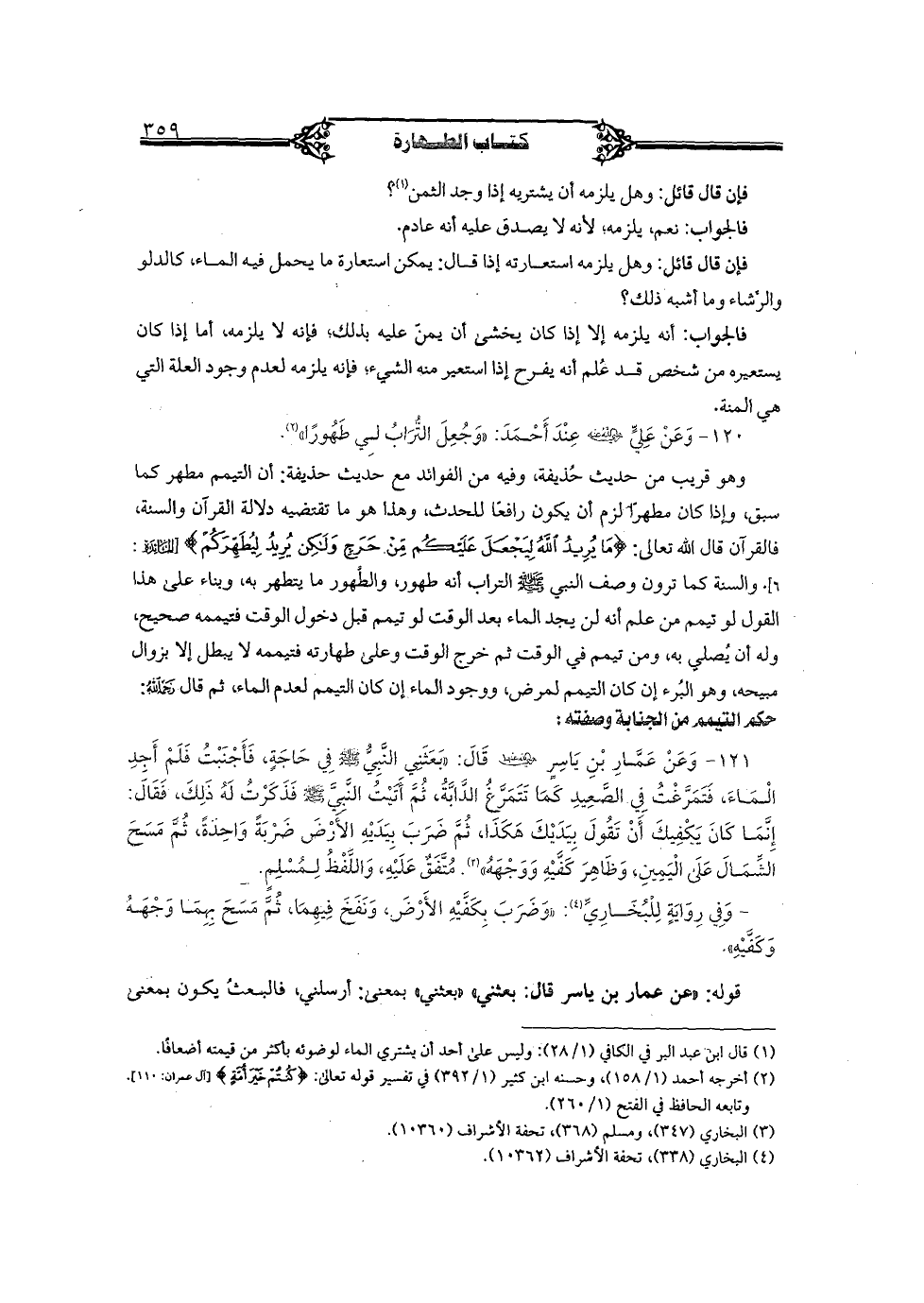 121 - وعن عمار بن ياسر رضي الله عنهما قال: "بعثني النبي صلى الله عليه وسلم في حاجة، فأجنبت فلم أجد الماء، فتمرغت في الصعيد كما تتمرغ الدابة، ثم أتيت النبي صلى الله عليه وسلم فذكرت له ذلك، فقال: إنما كان يكفيك أن تقول بيديك هكذا، ثم ضرب بيديه الأرض ضربة واحدة، ثم مسح الشمال هلى اليمين، وظاهر كفيه ووجهه". متفق عليه، واللفظ لمسلم.