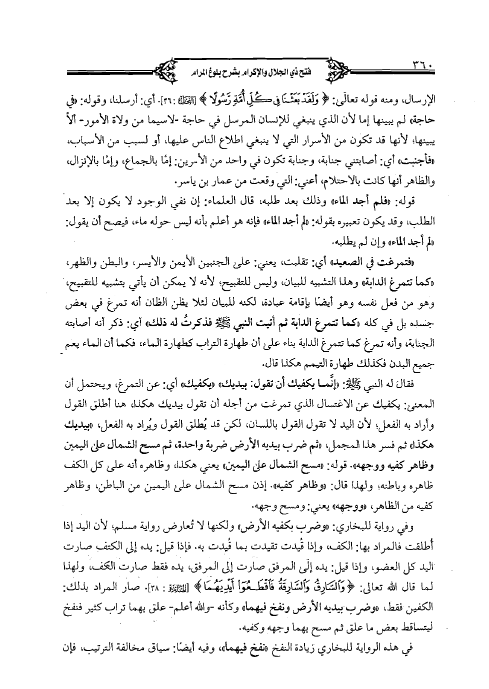 فقال له النبي صلى الله عليه وسلم: "إنما يكفيك أن تقول: بيديك" "يكفيك" أي: عن التمرغ، ويحتمل أن المعنى: يكفيك عن الاغتسال الذي تمرغت من أجله أن تقول بيديك هكذا، هنا أطلق القول وأراد به الفعل؛ لأن اليد لا تقول القول باللسان، لكن قد يطلق القول ويراد به الفعل، "بيديك هكذا" ثم فسر هذا المجمل، "ثم ضرب بيديه الأرض ضربة واحدة، ثم مسح الشمال على اليمين وظاهر كفيه ووجهه". قوله: "مسح الشمال على المين" يعني هكذا، وظاهره أنه على كل الكف ظاهره وباطنه؛ ولهذا قال: "وظاهر كفيه". إذن مسح الشمال على اليمين من الباطن، وظاهر كفيه من الظاهر، "ووجهه" يعني: ومسح وجهه.
