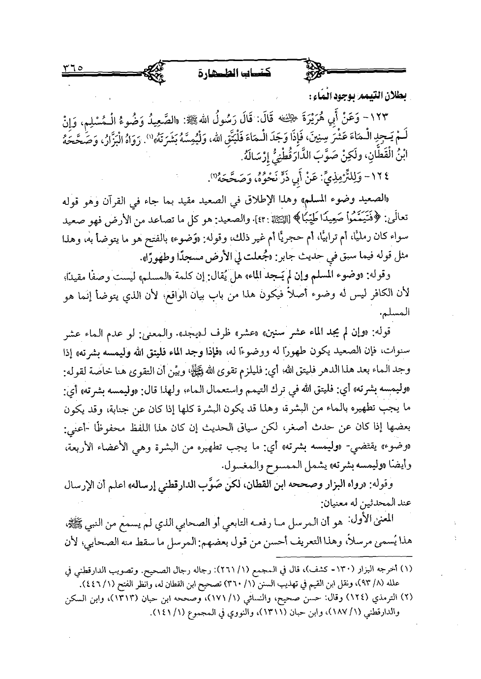 123 - وعن أبي هريرة رضي الله عنه قال: قال رسول الله صلى الله عليه وسلم: "الصعيد وضوء المسلم، وإن لم يجد الماء عشر سنين، فإذا وجد الماء فليتق الله، وليمسه بشرته". رواه البزار وصححه ابن القطان، ولكن صوب الدارقطني إرساله.
