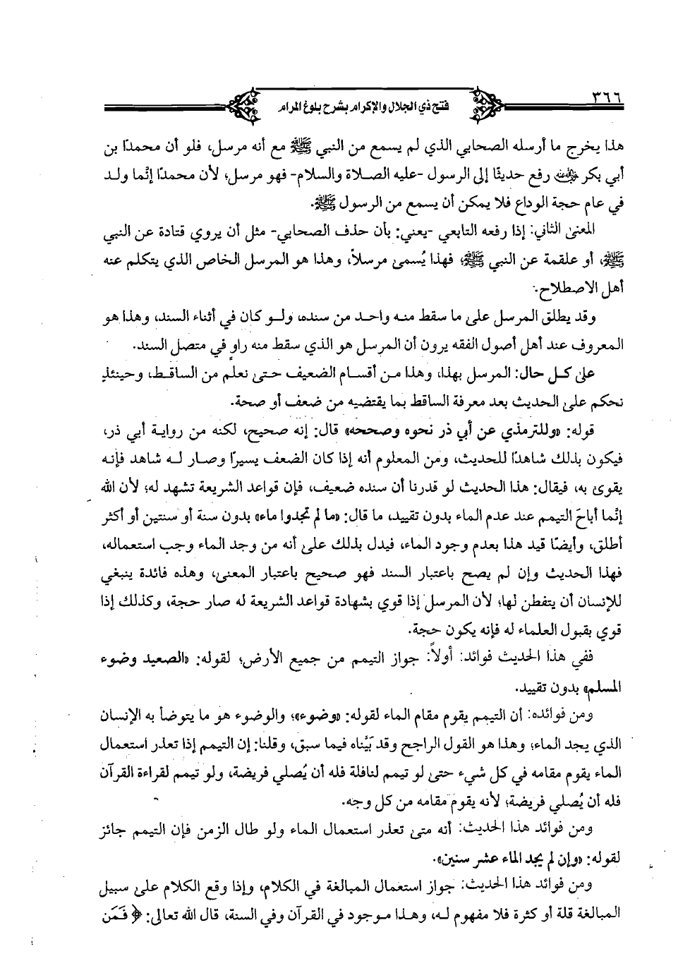 قوله: "وللترمذي عن أبي ذر نحوه وصححه" قال: إنه صحيح، لكنه من رواية أبي ذر، فيكون بذلك شاهدا للحديث، ومن المعلوم انه إذا كان الضعيف يسيرا وصار له شاهد فإنه يقوى به، فيقال: هذا الحديث لو قدرنا أن سنده ضعيف، فإن قواعد الشريعة تشهد له؛ لأن الله إنما أباح التيمم عند عدم الماء بدون تقييد، ما قال: "ما لم تجدوا ماء" بدون سنة أو سنتين أو أكثر أطلق، وأيضا قيد هذا بعدم وجود الماء، فيدل بذلك على أنه من وجد الماء وجب استعماله، فهذا الحديث وإن لم يصح باعتبار السند فهو صحيح باعتبار المعنى، وهذه فائدة ينبغي للإنسان أن يتفطن لها؛ لأن المرسل إذا قوي بشهادة قواعد الشريعة له صار حجة، وكذلك إذا قوي بقبول العلماء له فإنه يكون حجة.