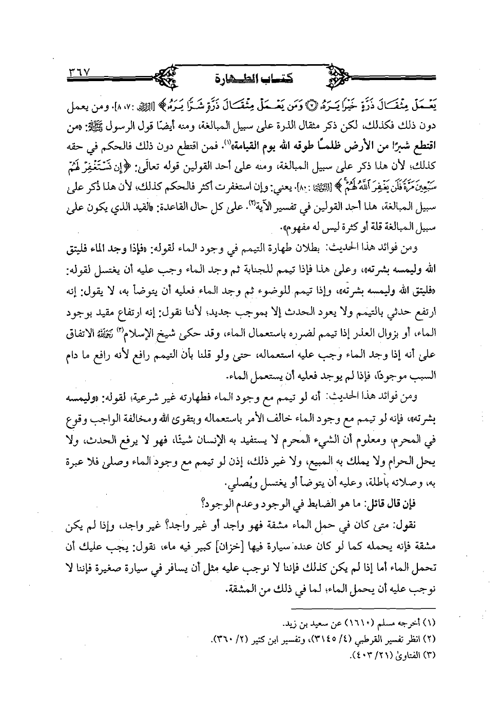 نقول: متى كان في حمل الماء مشقة فهو واجد او غير واجد؟ غير واجد، وإذا لم يكن مشقة فإنه يحمله كما لو كان عنده سيارة فيها [خزان] كبير فيه ماء، نقول: يجب عليك أن تحمل الماء أما إذا لم يكن كذلك فإننا لا نوجب عليه مثل أن يسافر في سيارة صغيرة فإننا لا نوجب عليه أن يحمل الماء؛ لما في ذلك في المشقة.