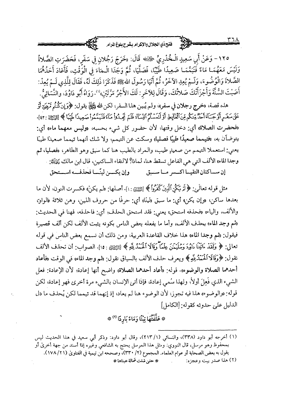 مثل قوله تعالى: {لم يكن الذين كفروا} [البينة: 1]. أصلها: "لم يكن" فكسرت النون؛ لأن ما بعدها ساكن، "وإن يكن" أي: ما سبق "لينا" أي: حرفا من حروف اللين، وهي ثلاثة "الواو، والألف، والياء" "فحذفه استحق" يعني: فقد استحق الحذف؛ أي: فأحذفه، فهنا في الحديث: "ثم وجد الماء" بحذف الألف، وأما ما يفعله بعض الناس بكونه يثبت الألف لكن ألف قصيرة فيقول: "ثم وجدا الماء" هذا حلاف القاعدة العربية، ومن ذلك أن نسمع بعض الناس في قوله تعالى: {ولقد ءاتينا داود وسليمن علما وقالا الحمد لله} [النمل: 15]. الصواب: أن تحذف الألف نقول: {وقالا الحمد لله} وزيعرف حذف الألف بالساق نقول: "ثم وجد الماء" في الوقت "فأعاد أحدهما الصلاة والوضوء". قوله: "أعاد أحدهما الصلاة" واضح أنها إعادة؛ لأن الإعادة: فعل الشيء الذي فعل أولا؛ ولهذا سمي إعادة، فإذا أتى الإنسان بالشيء مرة أخرى فهو إعادة، لكن قوله: "والوضوء" هذا فيه تجوز؛ لأن الوضوء هنا لم يعاد؛ إذ إنهما قد تيمما لكن يحذف ما دل الدليل على حدوثه كقوله: [الكامل].