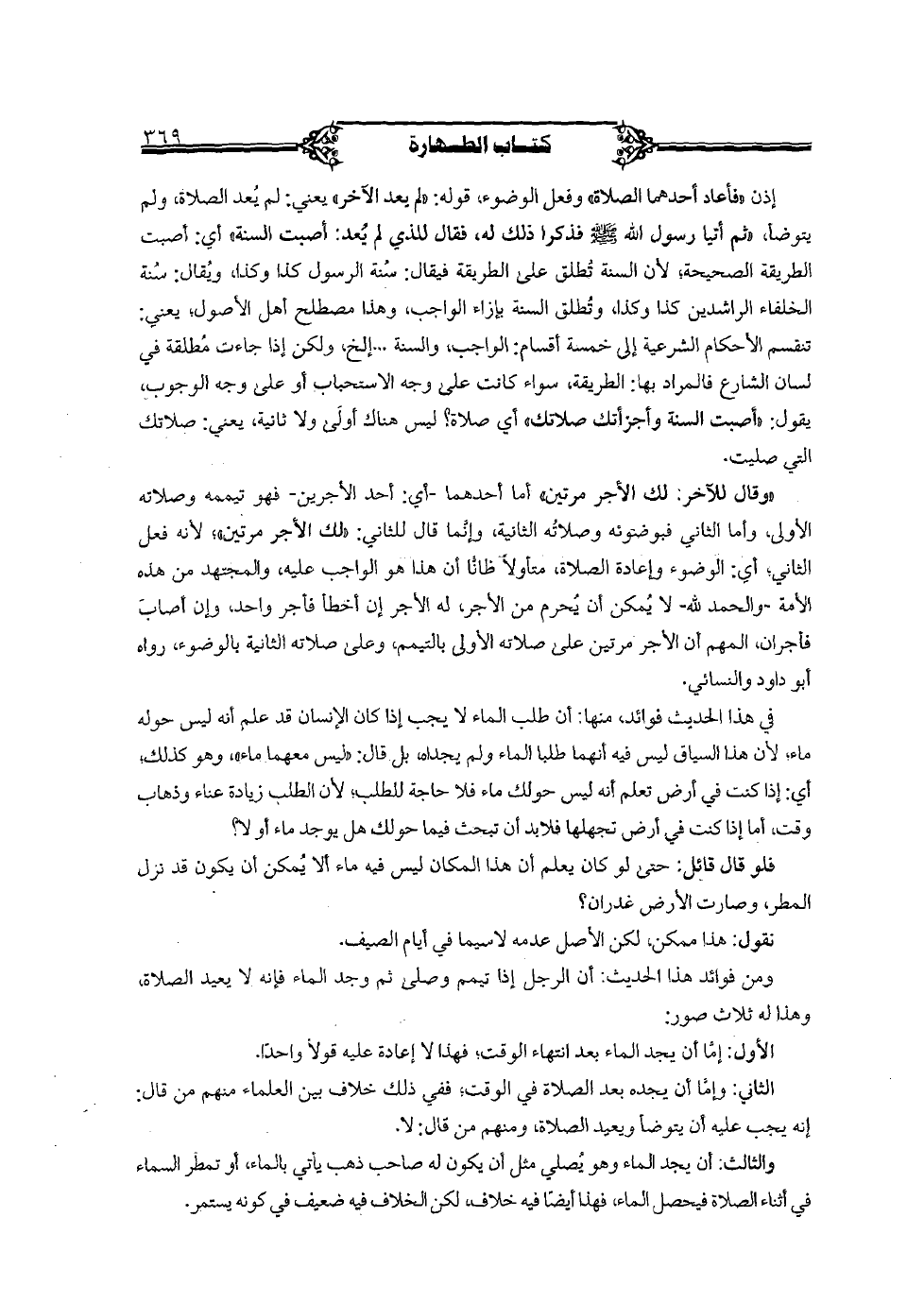 ومن فوائد هذا الحديث: أن الرجل إذا تيمم وصلى ثم وجد الماء فإنه لا يعيد الصلاة، وهذا له ثلاث صور: