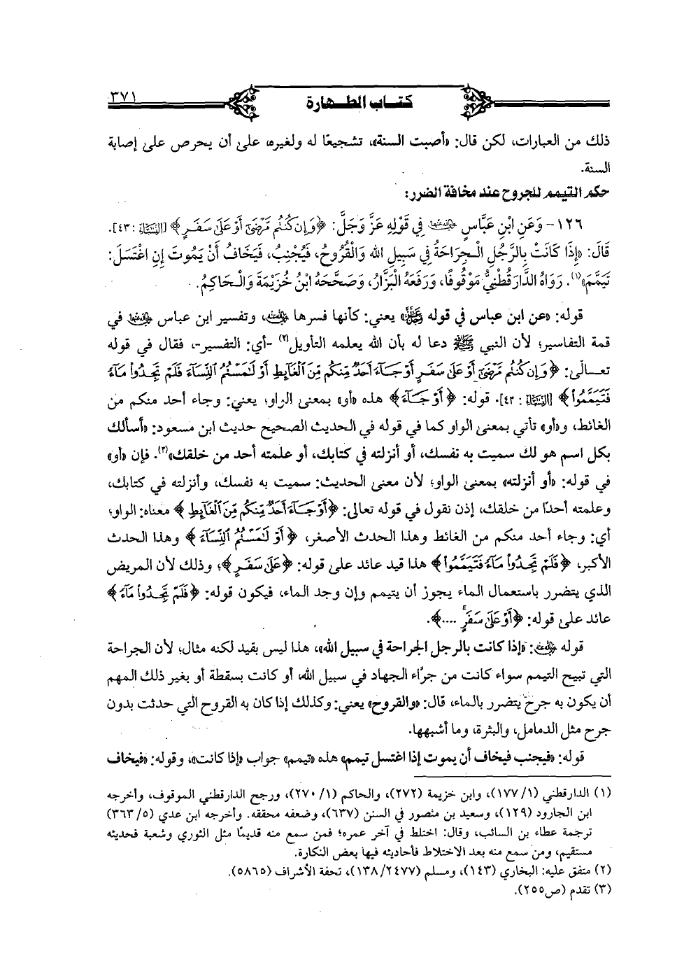 126 - وعن ابن عباس رضي الله عنهما في قوله عز وجل: {وإن كنتم مرضى أو على سفر} [النساء: 43].