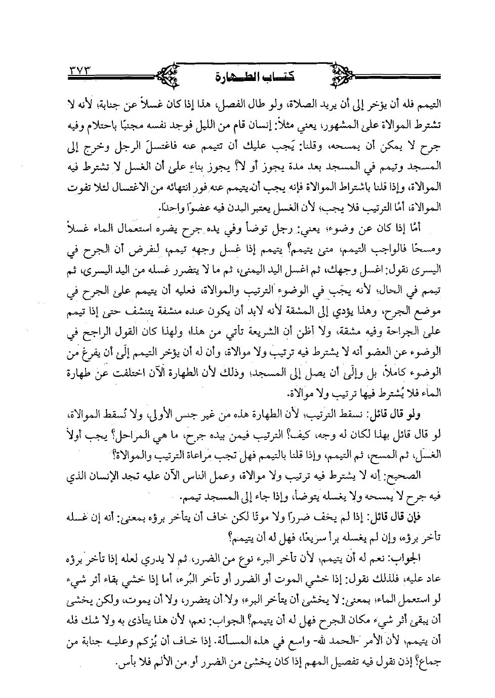 ولو قال قائل: نسقط الترتيب؛ لأن الطهارة هذه من غير جنس الأولى، ولا نسقط الموالاة، لو قال قائل بهذا لكان له وجه، كيف؟ الترتيب فيمن بيده جرح، ما هي المراحل؟ يجب أولا الغسل، ثم المسح، ثم التيمم، وإذا قلنا بالتيمم فهل تجب مراعاة الترتيب والموالاة؟