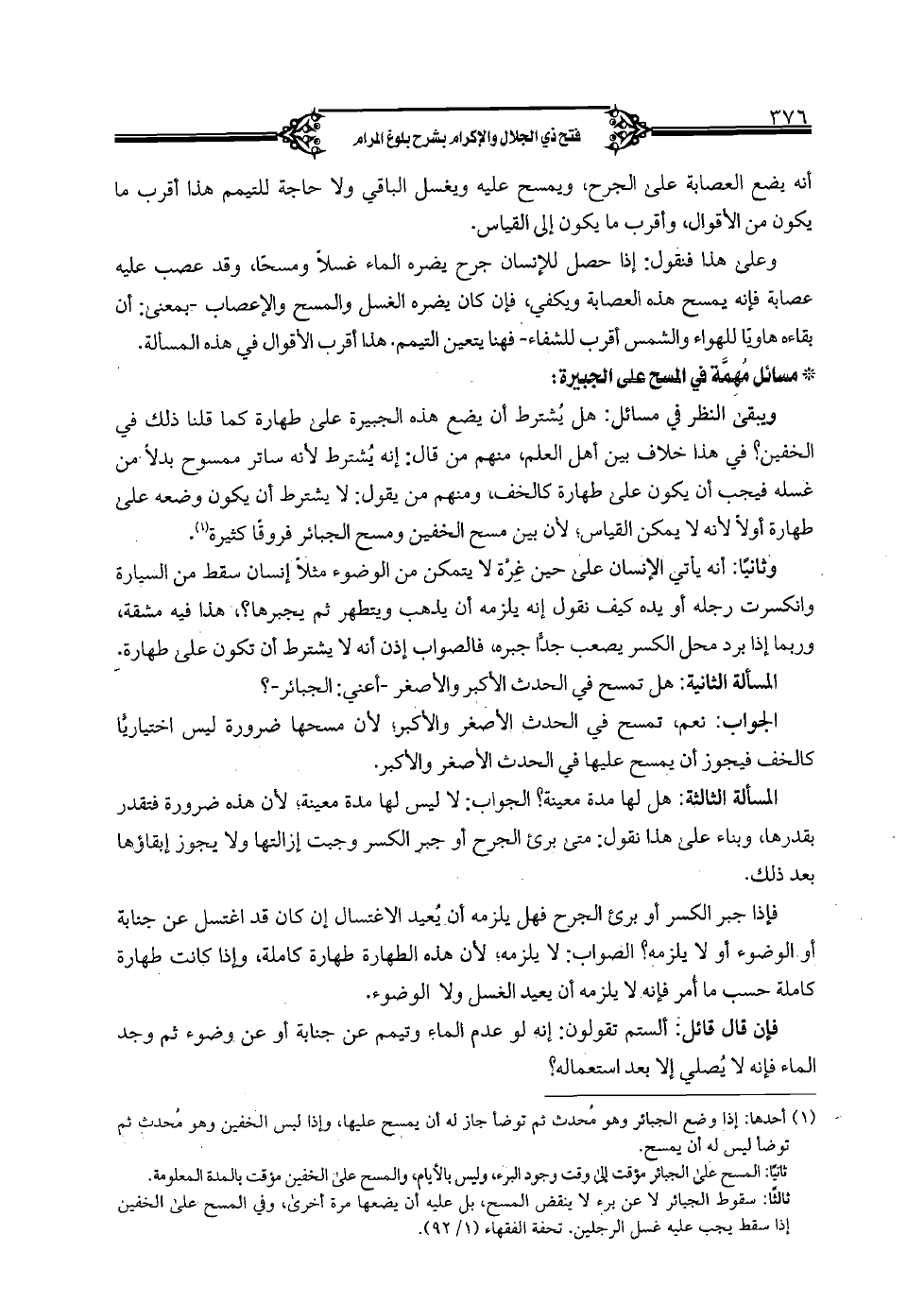 ويبقى النظر في مسائل: هل يشترط أن يضع هذه الجبيرة على طهارة كما قلنا ذلك في الخفين؟ في هذا خلاف بين أهل العلم، منهم من قال: إنه يشترط لأنه ساتر ممسوح بدلا من غسله فيجب أن يكون على طهارة كالخف، ومنهم من يقول: لا يشترط أن يكون وضعه على طهارة أولا لأنه لا يمكن القياس؛ لأن بين مسح الخفين ومسح الجبائر فروقا كثيرة.
