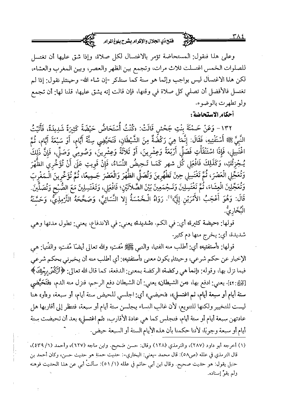 132 - وعن حمنة بنت جحشٍ قالت: «كنت أستحاض حيضةً كثيرةً شديدةً, فأتيت النبي صلى الله عليه وسلم أستفتيه, فقال: إنما هي ركضة من الشيطان, فتحيضي ستة أيام, أو سبعة أيام, ثم اغتسلي, فإذا استنفأت فصلي أربعةً وعشرين, أو ثلاثةً وعشرين, وصومي وصلي, فإن ذلك يجزئك, وكذلك فافعلي كل شهر كما تحيض النساء, فإن قويت على أن تؤخري الظهر وتعجلي العصر, ثم تغتسلي حين تطهرين وتصلي الظهر والعصر جميعًا, ثم تؤخرين المغرب وتعجلين العشاء, ثم تغتسلين وتجمعين بين الصلاتين؛ فافعلي, وتغتسلين مع الصبح وتصلين. قال: وهو أعجب الأمرين إلي». رواه الخمسة إلا النسائي, وصححه الترمذي, وحسنه البخاري.