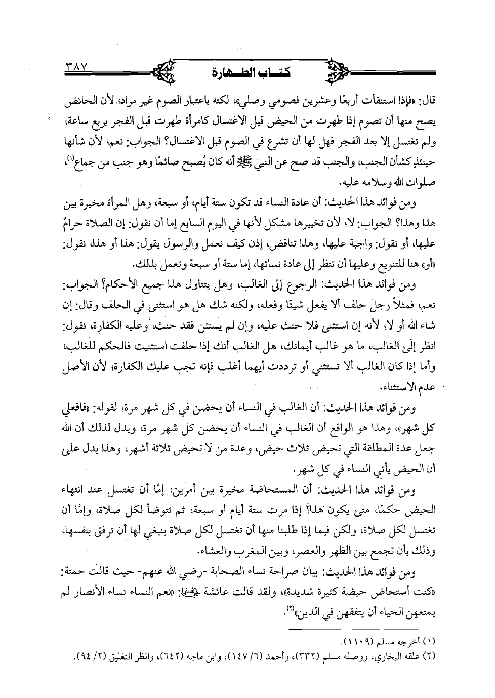 ومن فوائد هذا الحديث: أن عادة النساء قد تكون ستة أيام, أو سبعة, وهل المرأة مخيرة بين هذا وهذا؟ الجواب: لا؛ لأن تخييرها مشكل لأنها في اليوم السابع إما أن نقول: إن الصلاة حرام عليها, أو نقول: واجبة عليها, وهذا تناقض, إذن كيف نعمل والرسول يقول: هذا أو هذا, نقول: «أو» هنا للتنويع وعليها أن تنظر إلى عادة نسائها, إما ستة أو سبعة وتعمل بذلك.
