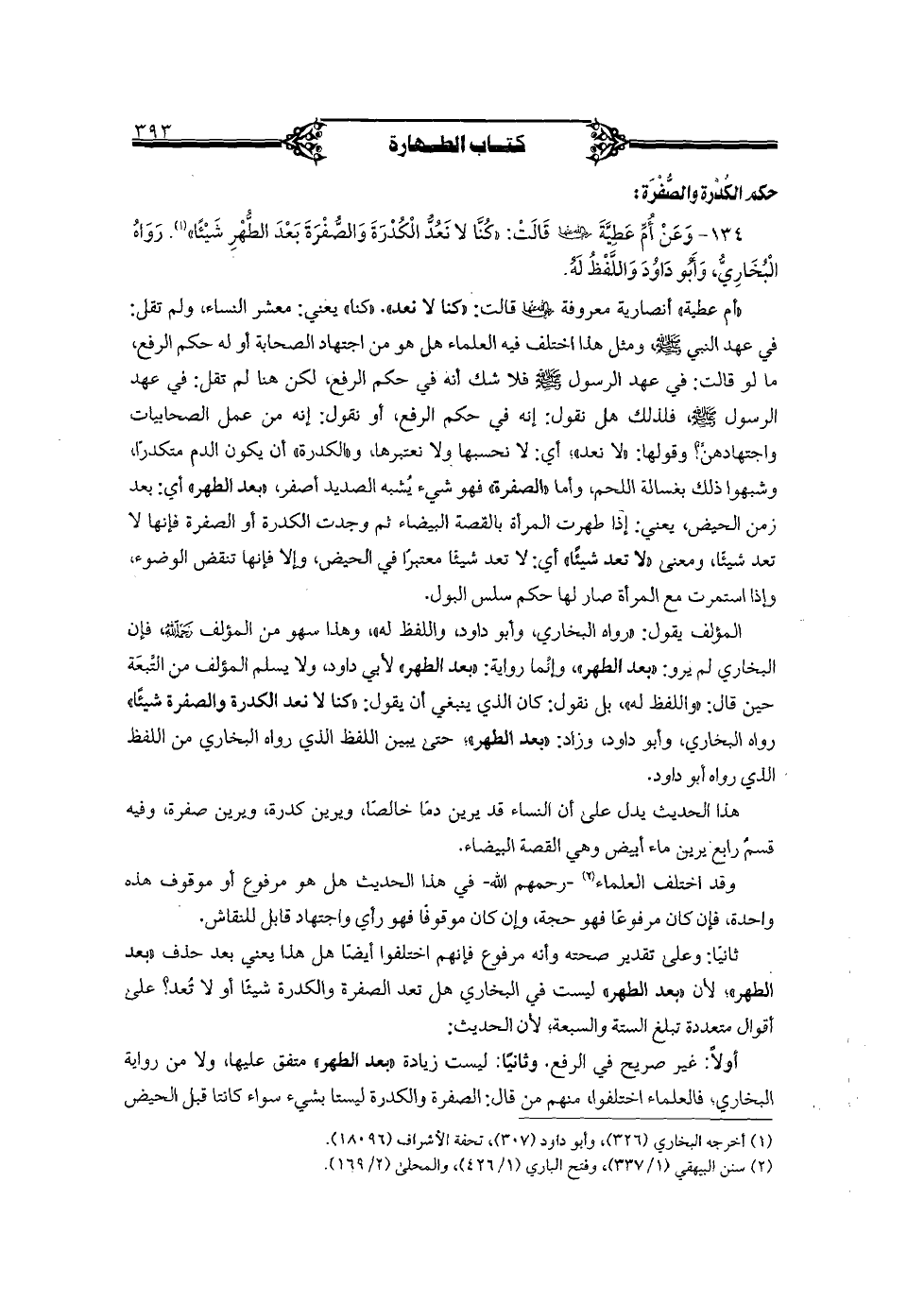 «أم عطية» أنصارية معروفة رضي الله عنها قالت: «كنا لا نعده». «كنا» يعني: معشر النساء, ولم تقل: في عهد النبي صلى الله عليه وسلم, ومثل هذا اختلف فيه العلماء هل هو من اجتهاد الصحابة أو له حكم الرفع, ما لو قالت: في عهد الرسول صلى الله عليه وسلم فلا شك أنه في حكم الرفع, لكن هنا لم تقل: في عهد الرسول صلى الله عليه وسلم, فلذلك هل نقول: إنه في حكم الرفع, أو نقول: إنه من عمل الصحابيات واجتهادهن؟ وقوله: «لا نعد»؛ أي: لا نحسبها ولا نعتبرها, و «الكدرة» أن يكون الدم متكدرًا, وشبهوا ذلك بغسالة اللحم, وأما «الصفرة» فهو شيء يشبه الصديد أصفر, «بعد الطهر» أي: بعد زمن الحيض, يعني: إذا طهرت المرأة بالقصة البيضاء ثم وجدت الكدرة أو الصفرة فإنها لا تعد شيئًا, ومعنى «لا تعد شيئًا» أي: لا تعد شيئًا معتبرًا في الحيض, وإلا فإنها تنقض الوضوء, وإذا استمرت مع المرأة صار لها حكم سلس البول.