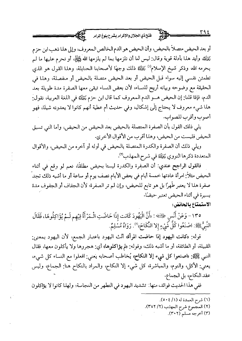 135 - وعن أن رضي الله عنه: «أن اليهود كانت إذا حاضت المرأة فيهم لم يؤاكلوها, فقال النبي صلى الله عليه وسلم: اصنعوا كل شيء إلا النكاح». رواه مسلم.