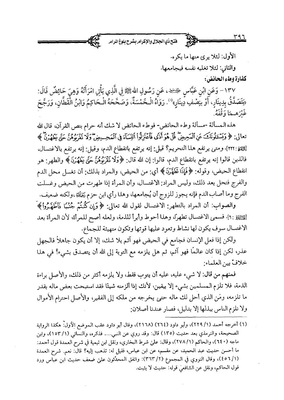 137 - وعن ابن عباس رضي الله عنهما, عن رسول صلى الله عليه وسلم في الذي يأتي امرأته وهي حائض قال: «يتصدق بدينارٍ, أو بنصف دينارٍ». رواه الخمسة, وصححه الحاكم وابن القطان, ورجح غيرهما وقفه.