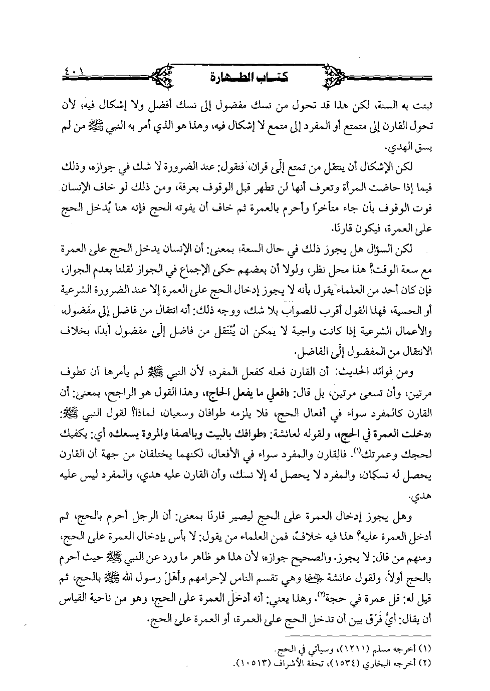وهل يجوز إدخال العمرة على الحج ليصير قارنًا بمعنى: أن الرجل أحرم بالرجل, ثم أدخل العمرة عليه؟ هذا فيه خلاف, فمن العلماء من يقول: لا بأس بإدخال العمرة على الحج, ومنهم من قال: لا يجوز. والصحيح جوازه؛ لأن هذا هو ظاهر ما ورد عن النبي صلى الله عليه وسلم حيث أحرم بالحج أولًا, ولقول عائشة رضي الله عنها وهي تقسم الناس لإحرامهم وأهل رسول الله صلى الله عليه وسلم بالحج, ثم قيل له: قل عمرة في حجة. وهذا يعني: أنه أدخل العمرة على الحج, وهو من ناحية القياس أن يقال: أي فرق بين أن تدخل الحج على العمرة, أو العمرة على الحج.