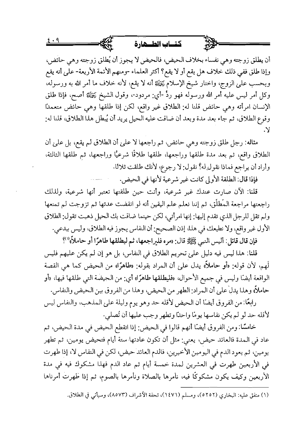 قلنا: هذا ليس فيه دليل على تحريم الطلاق في النفاس, بل هو إن لم يكن عليهم فليس لهم؛ لأن قوله: «أو حاملًا» يدل على أن المراد بقوله: «طاهرًا» من الحيض كما هي القصة الواقعة أيضًا وليس في جميع الأحوال, «فليطلقها طاهرًا» أي: من الحيضة التي طلقها فيها, «أو حاملًا» وهذا يدل على أن المراد: الطهر من الحيض, وهذا من الفروق بين الحيض والنفاس.