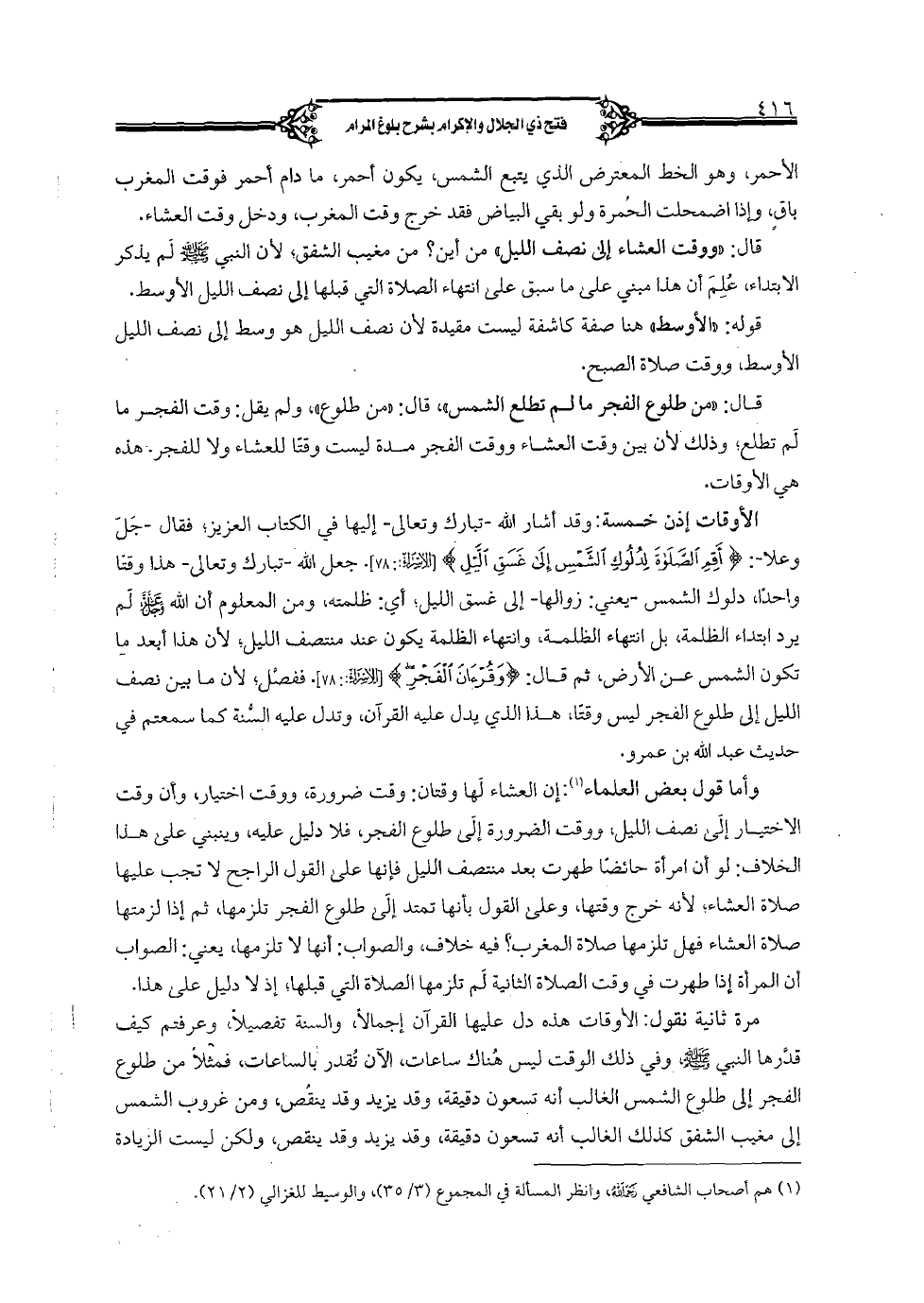 قال: «من طلوع الفجر ما لم تطلع الشمس» , قال: «من طلوع» , ولم يقل: وقت الفجر ما لم تطلع؛ وذلك لأن بين وقت العشاء ووقت الفجر مدة ليست وقتًا للعشاء ولا للفجر. هذه هي الأوقات.