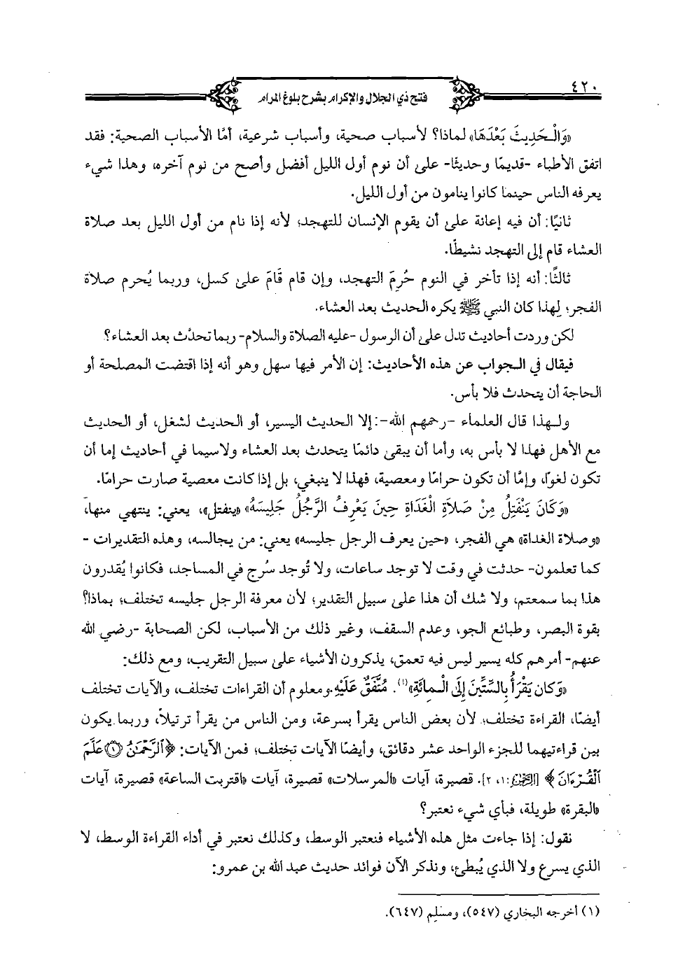 «وكان ينفتل من صلاة الغداة حين يعرف الرجل جليسه» «ينفتل» , يعني: ينتهي منها, «وصلاة الغداة» هي الفجر, «حين يعرف الرجل جليسه» يعني: من يجالسه, وهذه التقديرات - كما تعلمون - حدثت في وقت لا توجد ساعات, ولا توجد سرج في المساجد, فكانوا يقدرون هذا بما سمعتم, ولا شك أن هذا على سبيل التقدير؛ لأن معرفة الرجل جليسه تختلف؛ بماذا؟ بقوة البصر, وطبائع الجو, وعدم السقف, وغير ذلك من الأسباب, لكن الصحابة - رضي الله عنهم - أمرهم كله يسير ليس فيه تعمق, يذكرون الأشياء على سبيل التقريب, ومع ذلك: «وكان يقرأ بالستين إلى المائة». متفق عليه. ومعلوم أن القراءات تختلف, والآيات تختلف أيضًا, القراءة تختلف؛ لأن بعض الناس يقرأ بسرعة, ومن الناس من يقرأ ترتيلًا, وربما يكون بين قراءتيهما للجزء الواحد عشر دقائق, وأيضًا الآيات تختلف؛ فمن الآيات: {الرحمن (1) علم القرآن} [الرحمن: 1, 2]. قصيرة, آيات «المرسلات» قصيرة, آيات «اقتربت الساعة» قصيرة, آيات «البقرة» طويلة, فبأي شيء نعتبر؟