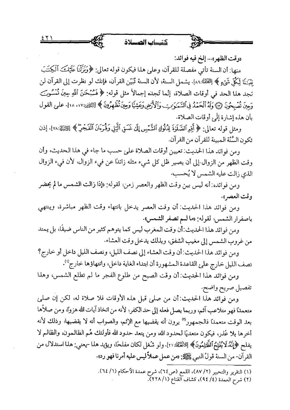 منها: أن السنة تأتي مفصلة للقرآن, وعلى هذا فيكون قوله تعالى: {ونزلنا عليك الكتاب تبيانًا لكل شيء} [النحل: 89]. يشمل السنة, لأن السنة تبين القرآن, فإنك لو نظرت إلى القرآن لن تجد هذا الحد في أوقات الصلاة, إنما تجده إجمالًا مثل قوله: {فسبحن الله حين تمسون وحين تصبحون (17) وله الحمد في السماوات والأرض وعشيا وحين تظهرون} [الروم: 17, 18]. على القول بأن هذه إشارة إلى أوقات الصلاة.