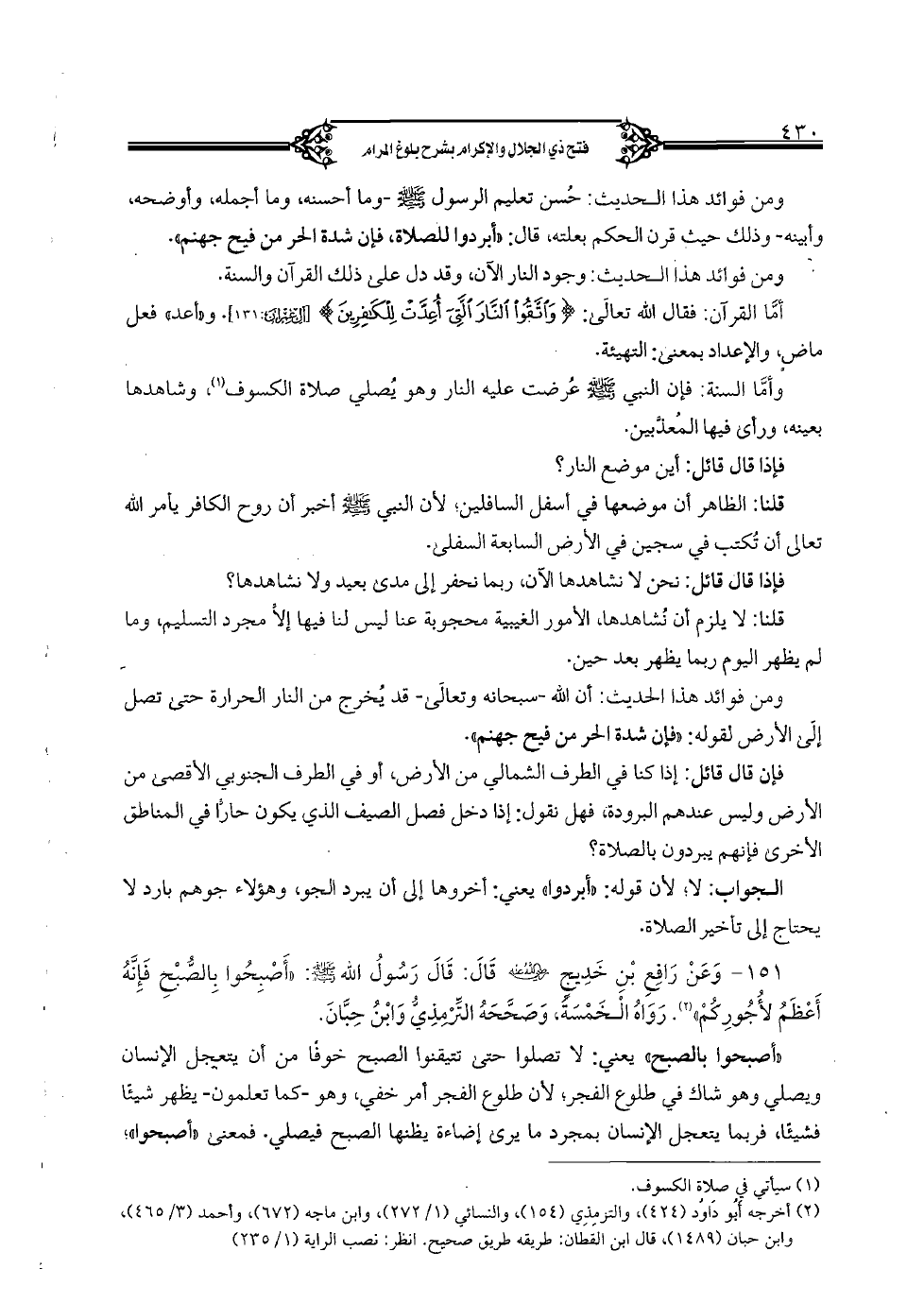 151 - وعن رافع بن خديج رضي الله عنه قال: قال رسول الله صلى الله عليه وسلم: «أصبحوا بالصبح فإنه أعظم لأجوركم». رواه الخمسة, وصححه الترمذي وابن حبان.