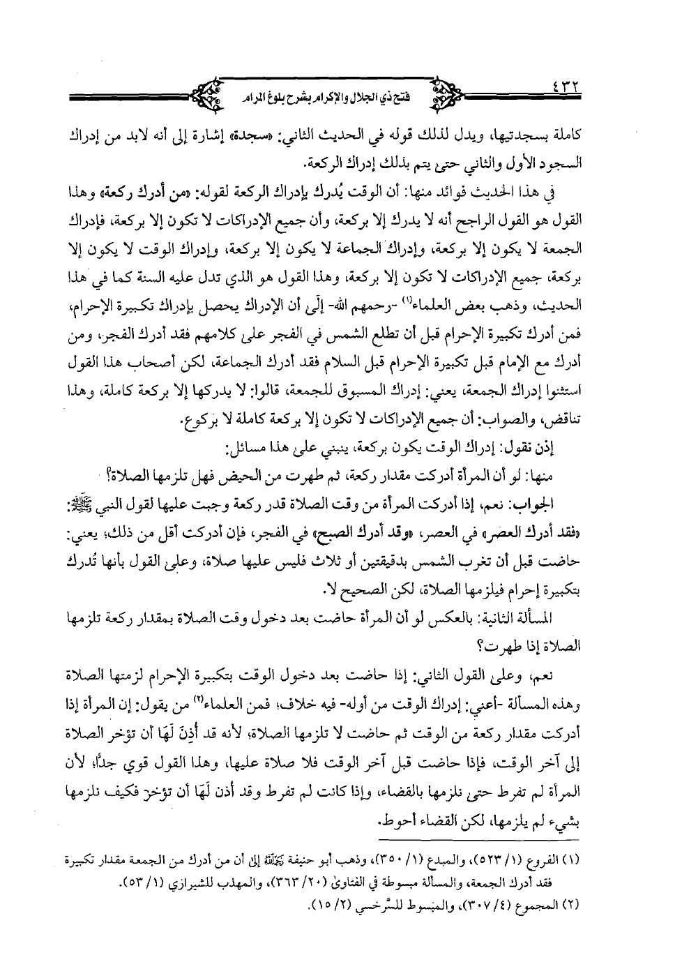 منها: لو أن المرأة أدركت مقدار ركعة, ثم طهرت من الحيض فهل تلزمها الصلاة؟
