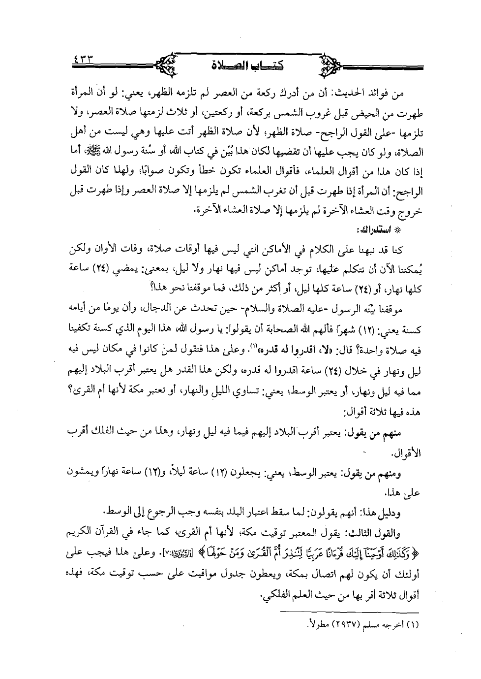 كنا قد نبهنا على الكلام في الأماكن التي ليس فيها أوقات صلاة, وفات الأوان ولكن يمكننا لآن أن نتكلم عليها, توجد أماكن ليس فيها نهار ولا ليل, بمعنى: يمضي (24) ساعة كلها نهار, أو (24) ساعة كلها ليل, أو أكثر من ذلك, فما موقفنا نحو هذا؟