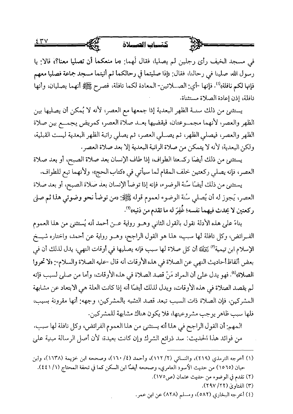 في مسجد الخيف رأى رجلين لم يصليا, فقال لهما: «ما منعكما أن تصليا معنا؟ » قالا: يا رسول الله, صلينا في رحالنا, فقال: «إذا صليتما في رحالكما ثم أتيتما مسجد جماعة فصليا معهم فإنها لكم نافلة». فإنها - أي: الصلاتين - المعادة لكما نافلة, فصرح صلى الله عليه وسلم أنهما يصليان, وأنها نافلة, إذن إعادة الصلاة مستثناة.