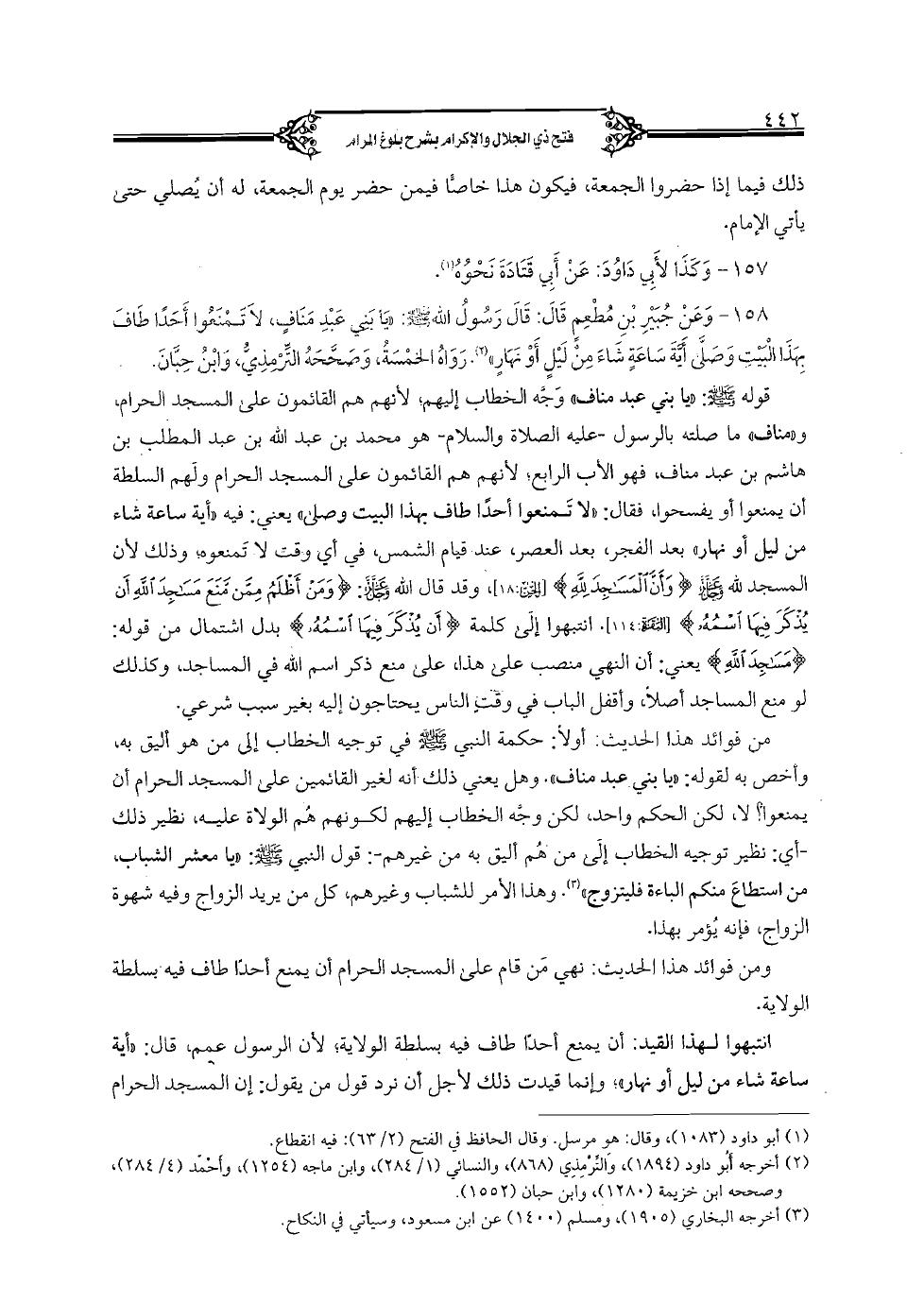 قوله صلى الله عليه وسلم: «يا بني عبد مناف» وجه الخطاب إليهم؛ لأنهم هم القائمون على المسجد الحرام, و «مناف» ما صلته بالرسول - عليه الصلاة والسلام - هو محمد بن عبد الله بن عبد المطلب بن هاشم بن عبد مناف, فهو الأب الرابع؛ لأنهم هم القائمون على المسجد الحرام ولهم السلطة أن يمنعوا أو يفسحوا, فقال: «لا تمنعوا أحدًا طاف بهذا البيت وصلى» يعني: فيه «أية ساعة شاء من ليل أو نهار» بعد الفجر, بعد العصر, عند قيام الشمس, في أي وقت لا تمنعوه؛ وذلك لأن المسجد لله عز وجل {وأن المساجد لله} [الجن: 18] , وقد قال الله عز وجل: {ومن أظلم ممن منع مساجد الله أن يذكر فيها اسمه} [البقرة: 114]. انتبهوا إلى كلمة {أن يذكر فيها اسمه} بدل اشتمال من قوله: {مساجد الله} يعني: أن النهي منصب على هذا, على منع ذكر اسم الله في المساجد, وكذلك لو منع المساجد أصلًا, وأقفل الباب في وقت الناس يحتاجون إليه بغير سبب شرعي.