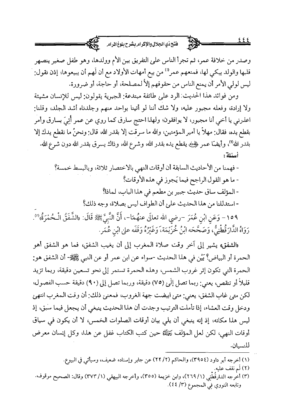 «الشفق» يشير إلى آخر وقت صلاة المغرب إلى أن يغيب الشفق, فما هو الشفق أهو الحمرة أو البياض؟ بين في هذه الحديث - سواء عن ابن عمر أو عن النبي صلى الله عليه وسلم - أن الشفق هو: الحمرة التي تكون إثر غروب الشمس, وهذه الحمرة تستمر إلى نحو تسعين دقيقة, ربما تزيد قليلًا أو تنقص, يعني: ربما تصل إلى (75) دقيقة, وربما تصل إلى (90) دقيقة حسب الفصول, لكن متى غاب الشفق, يعني: متى ابيضت جهة الغروب, فمعنى ذلك: أن وقت المغرب انتهى ودخل وقت العشاء, إذا تأملت الترتيب وجدت أن هذا الحديث ينبغي أن يجعل فيما سبق, إذ ليس هذا مكانه؛ إذ إنه ينبغي أن يلي بيان أوقات الصلوات الخمس, لا أن يكون في سياق أوقات النهي, لكن لعل المؤلف رحمه الله حين كتب الكتاب غفل عن هذا, وكل إنسان معرض للنسيان.