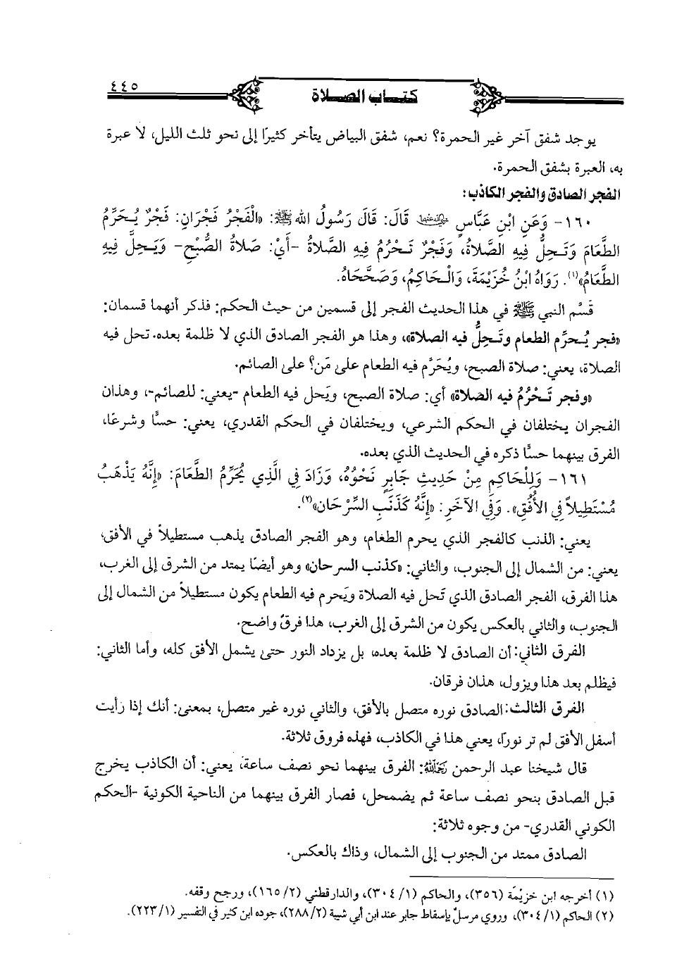 160 - وعن ابن عباس رضي الله عنهما قال: قال رسول الله صلى الله عليه وسلم: «الفجر فجران: فجر يحرم الطعام وتحل فيه الصلاة, وفجر تحرم فيه الصلاة - أي: صلاة الصبح - ويحل فيه الطعام». رواه ابن خزيمة, والحاكم, وصححاه.