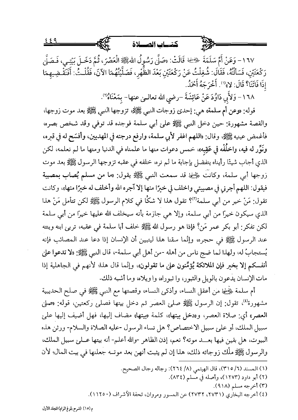 أم سلمة رضي الله عنها من أعقل النساء, وأذكى النساء, وقصتها مع النبي صلى الله عليه وسلم في صلح الحديبية مشهور, تقول: إن الرسول صلى الله عليه وسلم صلى العصر ثم دخل بيتها فصلى ركعتين, قوله: «صلى العصر» أي: صلاة العصر, و «دخل بيتها» , كلمة «بيتها» مضاف إليها, فهل أضيف إليها على سبيل الملك, أو على سبيل الاختصاص؟ هل نساء الرسول - عليه الصلاة والسلام - ورثن هذه البيوت, هل بقين فيها بعد موته؟ نعم, إذن الظاهر - والله أعلم - أنه بيتها على سبيل الملك, والرسول صلى الله عليه وسلم ملك زوجاته ذلك, هذا إن لم يثبت أنهن بعد موته جعلنها في بيت المال؛ لأن