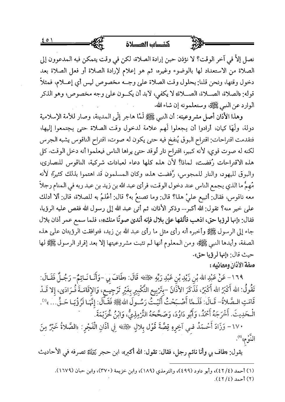 وهذا الأذان أصل مشروعيته: أن النبي صلى الله عليه وسلم لما هاجر إلى المدينة, وصار للأمة الإسلامية دولة, ولها كيان؛ أرادوا أن يجعلوا لهم علامة لدخول وقت الصلاة حتى يجتمعوا إليها؛ فتقدمت اقتراحات: اقتراح البوق ينفخ فيه حتى يكون له صوت, اقتراح الناقوس يشبه الجرس لكنه له صوت قوي؛ لأنه كبير, اقتراح نار توقد حتى يراها الناس فيعلموا أنه دخل الوقت. كل هذه الاقتراحات رفضت, لماذا؟ لأن هذه كلها دعاء لعبادات شركية, الناقوس للنصارى, والبوق لليهود, والناس للمجوس, رفضت هذه, وكان المسلمون قد اهتموا بذلك كثيرًا؛ لأنه مهم ما الذي يجمع الناس عند دخول الوقت, فرأى عبد الله بن زيد بن عبد ربه في المنام رجلًا معه ناقوس, فقال: أتبيع علي هذا؟ قال: وما تصنع به؟ قال: أعلم به للصلاة, قال: ألا أدلك على خير منه؟ تقول: الله أكبر ... وذكر الأذان, ثم أتى عبد الله إلى رسول الله فقص عليه الرؤيا, فقال: «إنها لرؤيا حق, اذهب فألقها على بلال فإنه أندى صوتًا منك»؛ , فلما سمع عمر أذان بلال جاء إلى الرسول صلى الله عليه وسلم وأخبره أنه رأى مثل ما رأى عبد الله بن زيد, فتوافقت الرؤيتان على هذه الصفة, وأيدها النبي صلى الله عليه وسلم, ومن المعلوم أنها لم تثبت مشروعيتها إلا بعد إقرار الرسول صلى الله عليه وسلم لها حيث قال: «إنها لرؤيا حق».