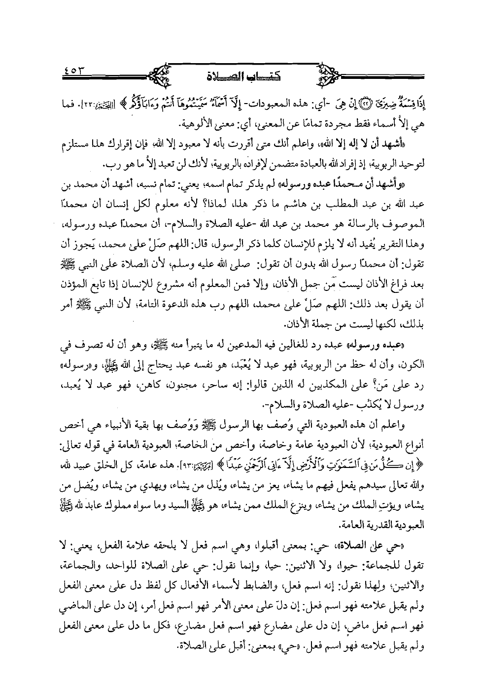 «وأشهد أن محمدًا عبده ورسوله» لم يذكر تمام اسمه؛ يعني: تمام نسبه, أشهد أن محمد بن عبد الله بن عبد المطلب بن هاشم ما ذكر هذا, لماذا؟ لأنه معلوم لكل إنسان أن محمدًا الموصوف بالرسالة هو محمد بن عبد الله - عليه الصلاة والسلام -, أن محمدًا عبده ورسوله, وهذا التقرير يفيد أنه لا يلزم للإنسان كلما ذكر الرسول, قال: اللهم صل على محمد, يجوز أن تقول: أن محمدًا رسول الله بدون أن تقول: صلى الله عليه وسلم؛ لأن الصلاة على النبي صلى الله عليه وسلم بعد فراغ الأذان ليست من جمل الأذان, وإلا فمن المعلوم أنه مشروع للإنسان إذا تابع المؤذن أن يقول بعد ذلك: اللهم صل على محمد, اللهم رب هذه الدعوة التامة؛ لأن النبي صلى الله عليه وسلم أمر بذلك, لكنها ليست من جملة الأذان.
