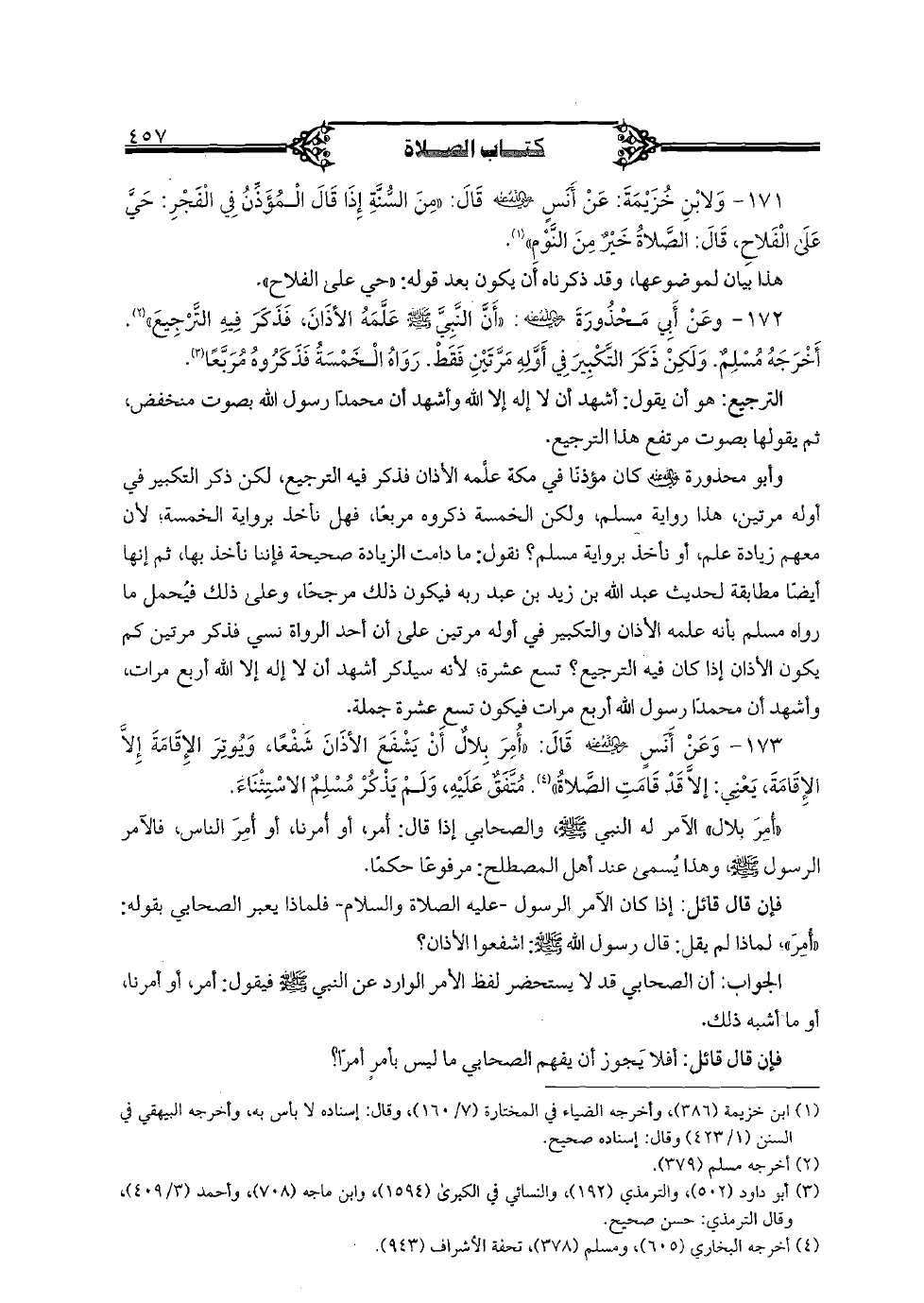 171 - ولابن خزيمة: عن أنس رضي الله عنه قال: «من السنة إذا قال المؤذن في الفجر: حي على الفلاح, قال: الصلاة خير من النوم».